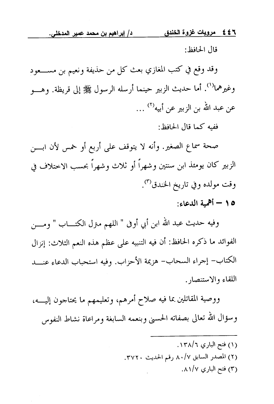 وفيه حديث عبد الله ابن أبي أوفى "اللهم منزل الكتاب" ومن الفوائد ما ذكره الحافظ: أن فيه التنبيه على عظم هذه النعم الثلاث: إنزال الكتاب- إجراء السحاب- هزيمة الأحزاب. وفيه استحباب الدعاء عند اللقاء والاستنصار.