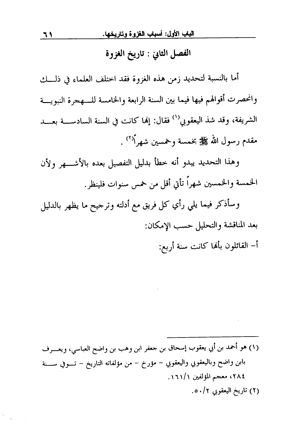 أما بالنسبة لتحديد زمن هذه الغزوة فقد اختلف العلماء في ذلك وانحصرت أقوالهم فيها فيما بين السنة الرابعة والخامسة للهجرة النبوية الشريفة، وقد شذ اليعقوبي1 فقال: إنها كانت في السنة السادسة بعد مقدم رسول الله صلى الله عليه وسلم بخمسة وخمسين شهراً2.