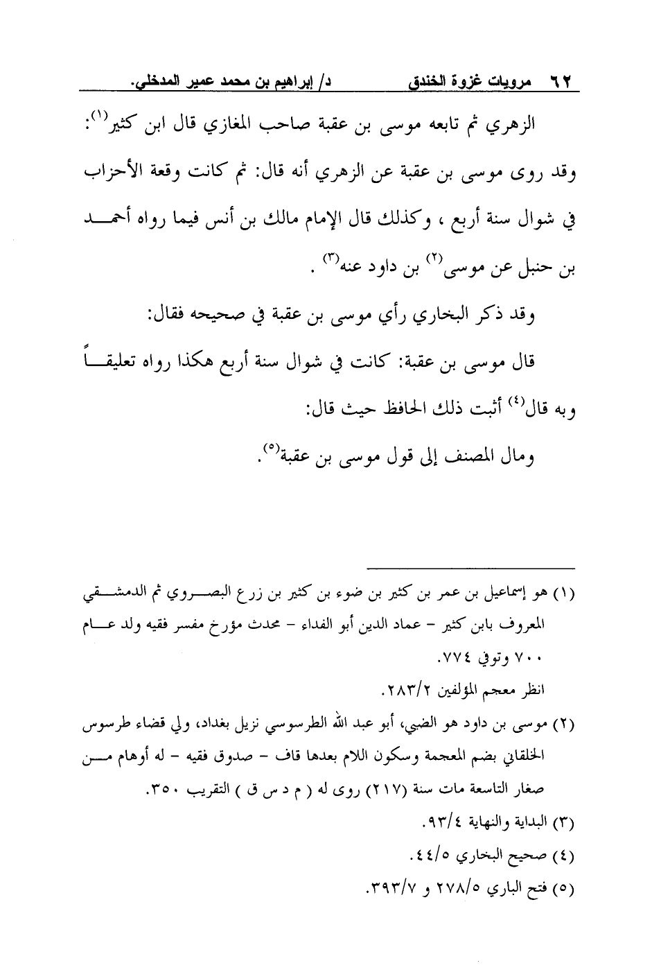 وقد ذكر البخاري رأي موسى بن عقبة في صحيحه فقال: "قال موسى بن عقبة: كانت في شوال سنة أربع" هكذا رواه تعليقاً وبه قال4 أثبت ذلك الحافظ حيث قال: "ومال المصنف إلى قول موسى بن عقبة5