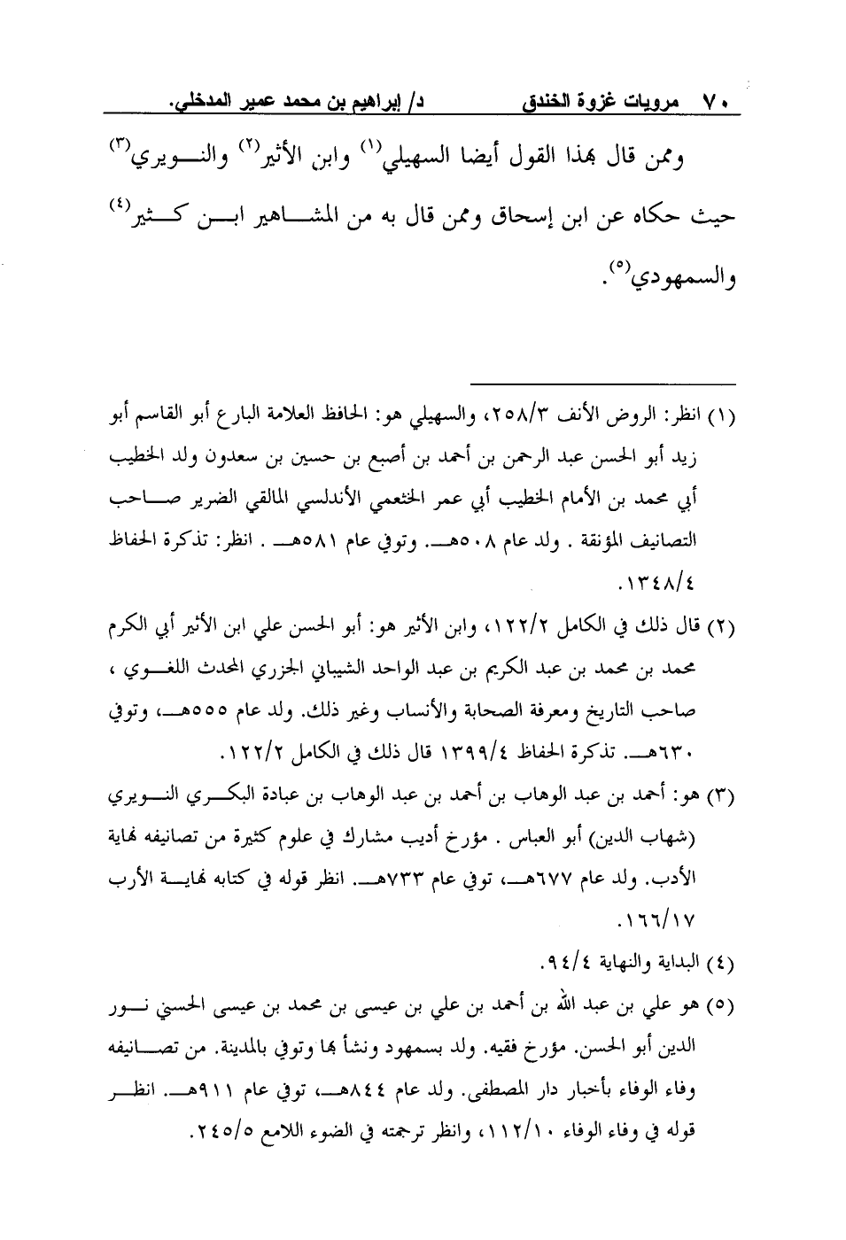 5 هو علي بن عبد الله بن أحمد بن علي بن عيسى بن محمد بن عيسى الحسني نور الدين أبو الحسن. مؤرخ فقيه. ولد بسمهود ونشأ بها وتوفي بالمدينة. من تصانيفه وفاء الوفاء بأخبار دار المصطفى. ولد عام 844هـ، توفي عام 911هـ. انظر قوله في وفاء الوفاء 10/112، وانظر ترجمته في الضوء اللامع 5/245.