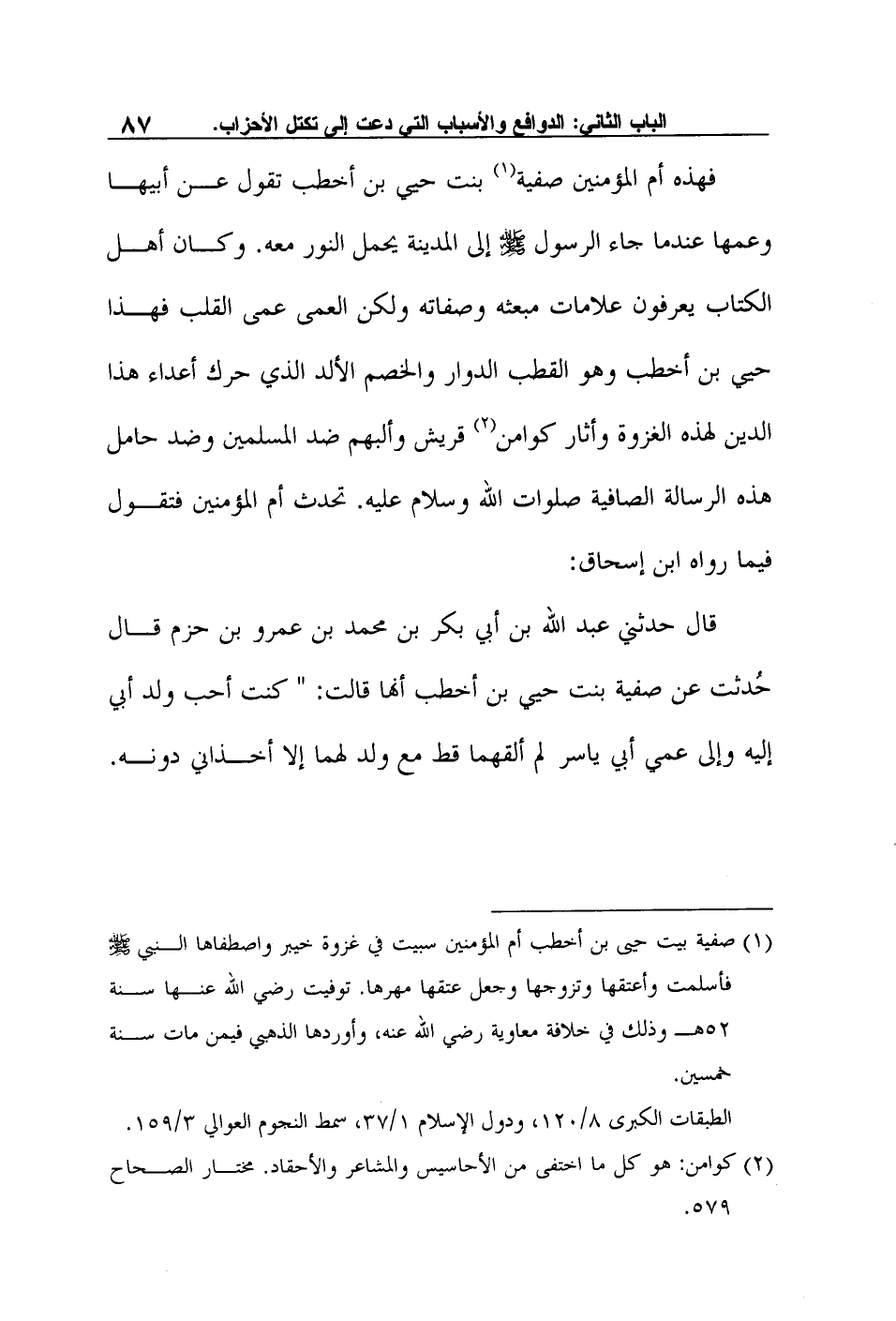 فهذه أم المؤمنين صفية1 بنت حيي بن أخطب تقول عن أبيها وعمها عندما جاء الرسول صلى الله عليه وسلم إلى المدينة يحمل النور معه. وكان أهل الكتاب يعرفون علامات مبعثه وصفاته ولكن العمى عمى القلب فهذا حيي بن أخطب وهو القطب الدوار والخصم الألد الذي حرك أعداء هذا الدين لهذه الغزوة وأثار كوامن2 قريش وألبهم ضد المسلمين وضد حامل هذه الرسالة الصافية صلوات الله وسلام عليه. تحدث أم المؤمنين فتقول فيما رواه ابن إسحاق: