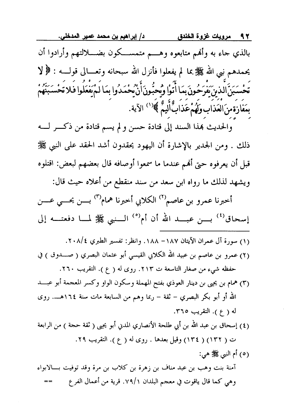 والحديث بهذا السند إلى قتادة حسن ولم يسم قتادة من ذكر له ذلك. ومن الجدير بالإشارة أن اليهود يحقدون أشد الحقد على النبي صلى الله عليه وسلم قبل أن يعرفوه حتى أنهم عندما ما سمعوا أوصافه قال بعضهم لبعض: اقتلوه ويشهد لذلك ما رواه ابن سعد من سند منقطع من أعلاه حيث قال: أخبرنا عمرو بن عاصم2 الكلابي أخبرنا همام3 بن يحي عن إسحاق4 بن عبد الله أن أم5 النبي صلى الله عليه وسلم لما دفعته إلى