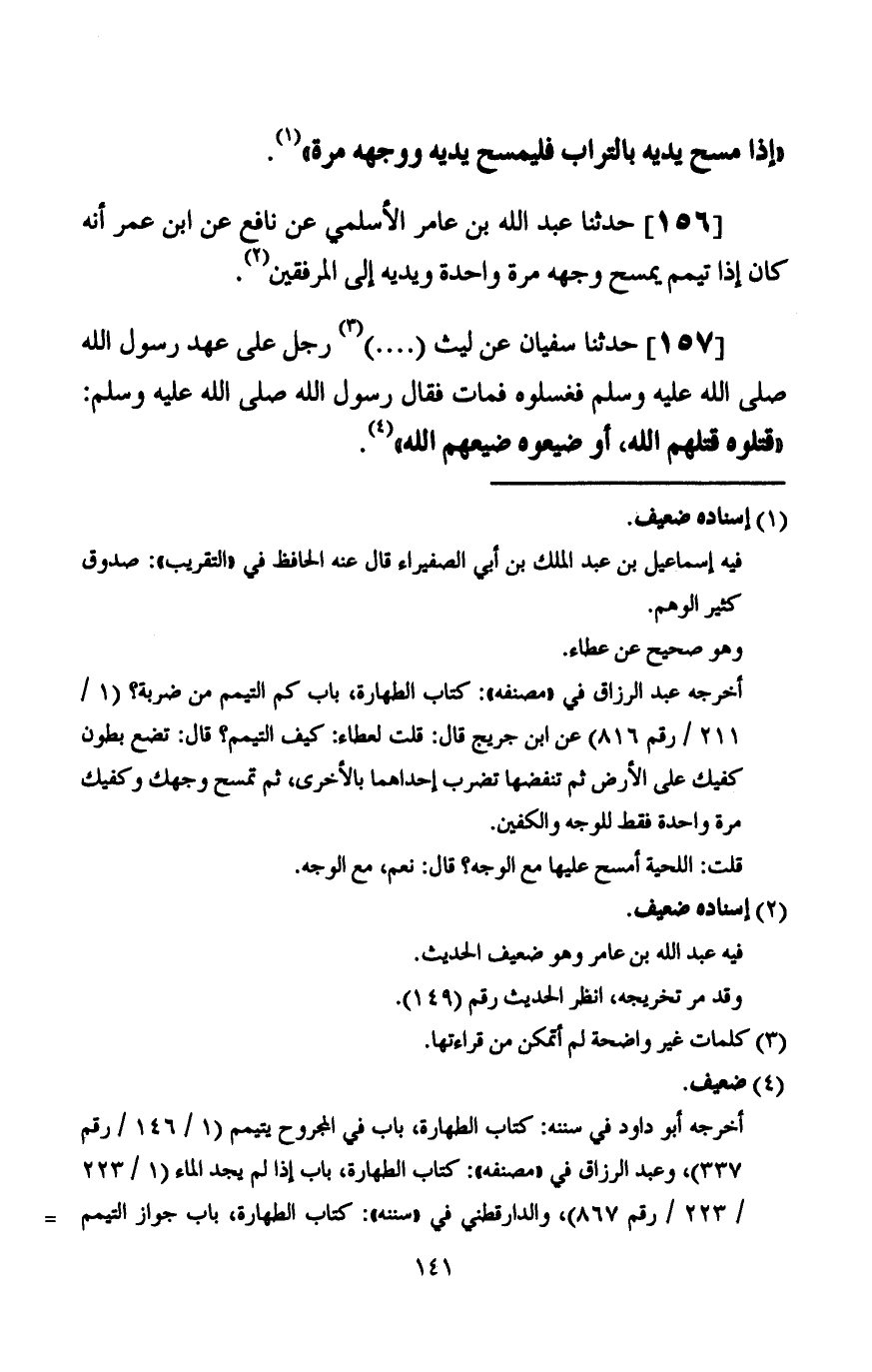 151 - حَدَّثَنَا الْعُمَرِيُّ، عَنْ نَافِعٍ، عَنِ ابْنِ عُمَرَ، أَنَّهُ قَالَ: " §التَّيَمُّمُ ضَرْبَتَانِ: ضَرْبَةٌ لِلْوَجْهِ، وَضَرْبَةٌ لِيَدَيْهِ إِلَى الْمِرْفَقَيْنِ "
