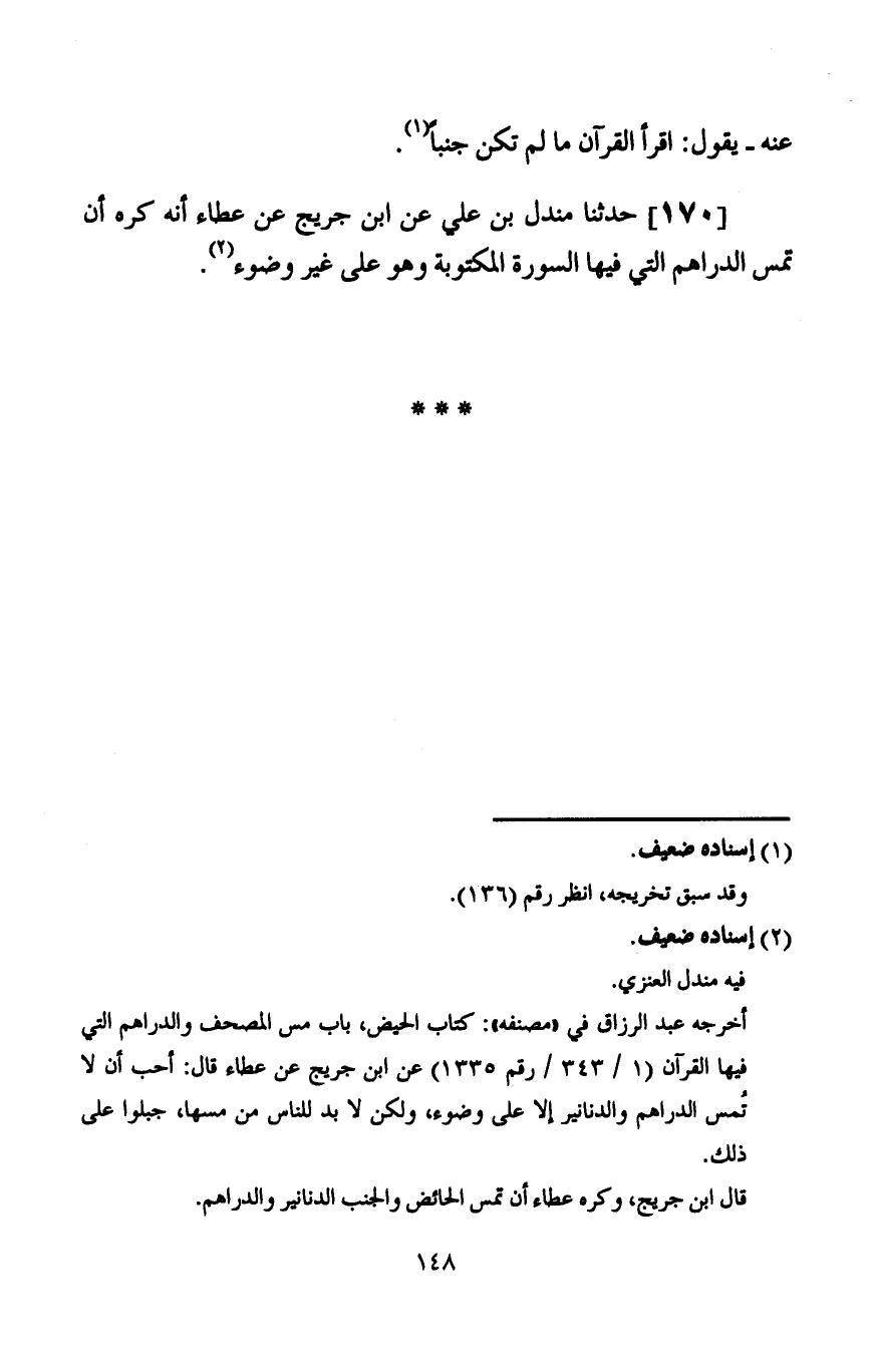 164 - حَدَّثَنَا ابْنُ عُيَيْنَةَ، عَنْ عَمْرِو بْنِ دِينَارٍ، عَنْ سَعِيدِ بْنِ الْحُوَيْرِثِ، عَنِ ابْنِ عَبَّاسٍ، قَالَ: كُنَّا عِنْدَ النَّبِيِّ صَلَّى اللهُ عَلَيْهِ وَسَلَّمَ فَدَخَلَ الْغَائِطَ، ثُمَّ رَجَعَ فَأُتِيَ بِطَعَامٍ، فَقِيلَ لَهُ: أَلَا تَوَضَّأُ؟ فَقَالَ: «§أَأُصَلِّي فَأَتَوَضَّأُ؟»