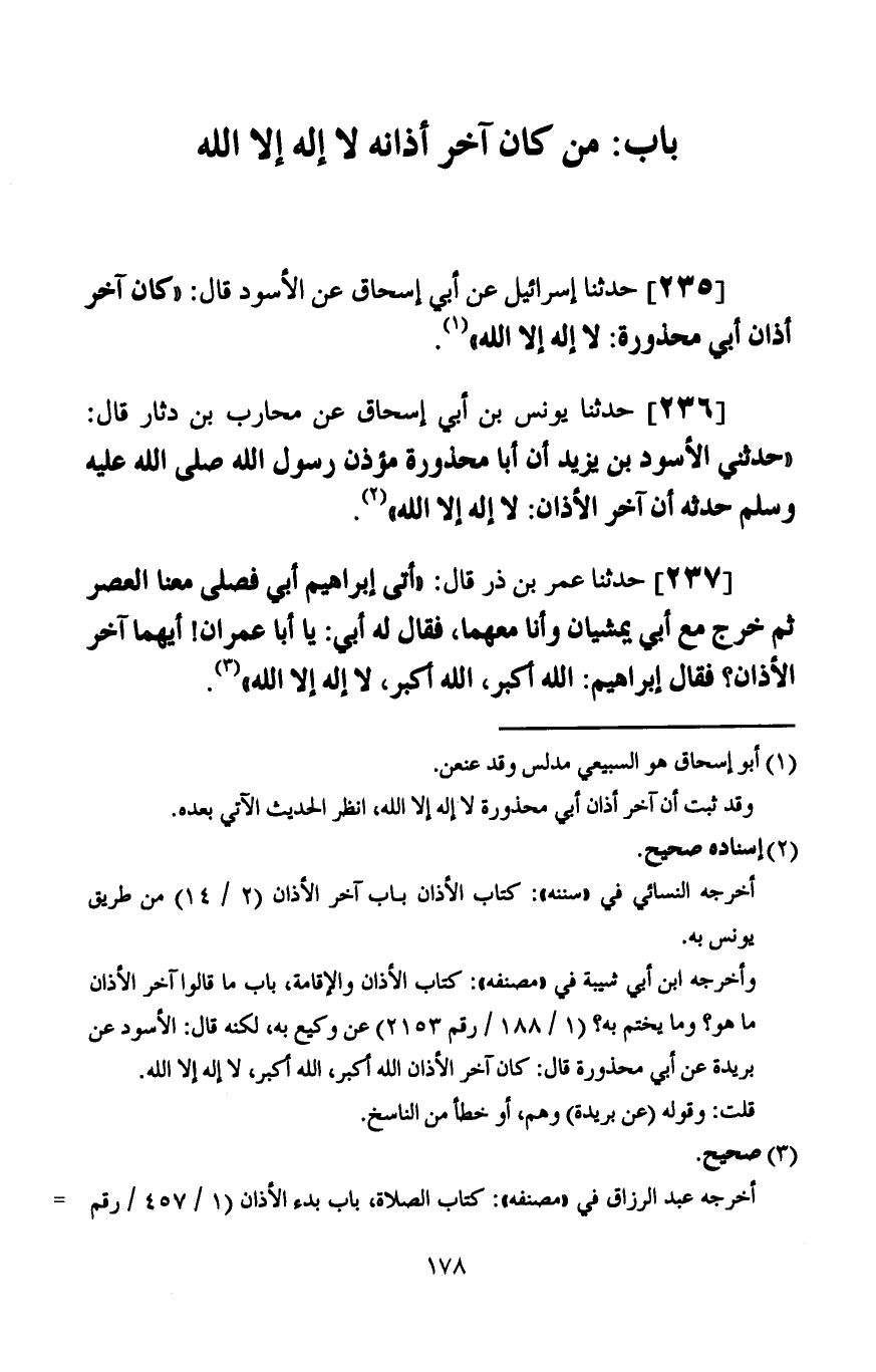 231 - حَدَّثَنَا إِسْرَائِيلُ، قَالَ: حَدَّثَنَا ثُوَيْرٌ، قَالَ: صَحِبْتُ ابْنَ عُمَرَ مِنَ الْمَدِينَةِ إِلَى مَكَّةَ، «فَكَانَ §إِذَا أَذَّنَ ثَنَّى»