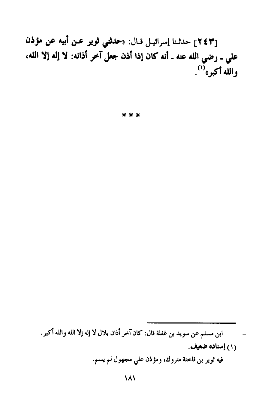 239 - حَدَّثَنَا أَبُو الْأَحْوَصِ، عَنْ عَبْدِ الْعَزِيزِ بْنِ رُفَيْعٍ، قَالَ: أَخْبَرَنِي قَائِدُ أَبِي مَحْذُورَةَ، عَنْ أَبِي مَحْذُورَةَ، أَنَّهُ " كَانَ §خَاتِمَةُ أَذَانِهِ: اللَّهُ أَكْبَرُ، اللَّهُ أَكْبَرُ، لَا إِلَهَ إِلَّا اللَّهُ "