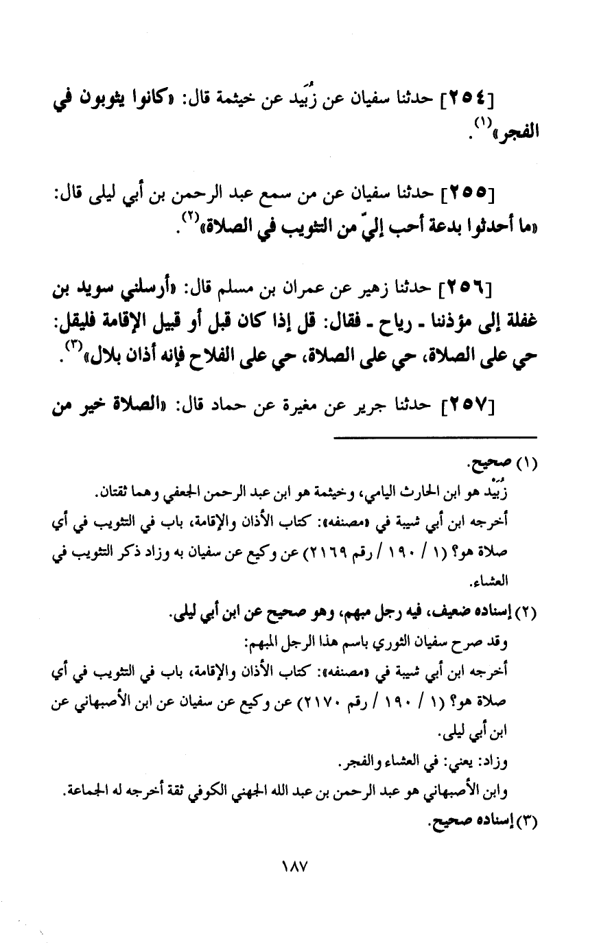 250 - حَدَّثَنَا إِسْرَائِيلُ، عَنْ حَكِيمِ بْنِ جُبَيْرٍ، عَنْ عِمْرَانَ بْنِ أَبِي الْجَعْدِ، قَالَ: سَمِعَ الْأَسْوَدُ، مُؤَذِّنًا يَقُولُ: الصَّلَاةُ خَيْرٌ مِنَ النَّوْمِ، بَعْدَمَا (. . .) فَقَالَ: " §وَيْحَكَ، لَا تَزْوِيْدَ فِي أَذَانِ اللَّهِ شَيْئًا، قَالَ: إِنِّي سَمِعْتُ النَّاسَ يَقُولُونَ، قَالَ: «فَلَا تَقُلْ»