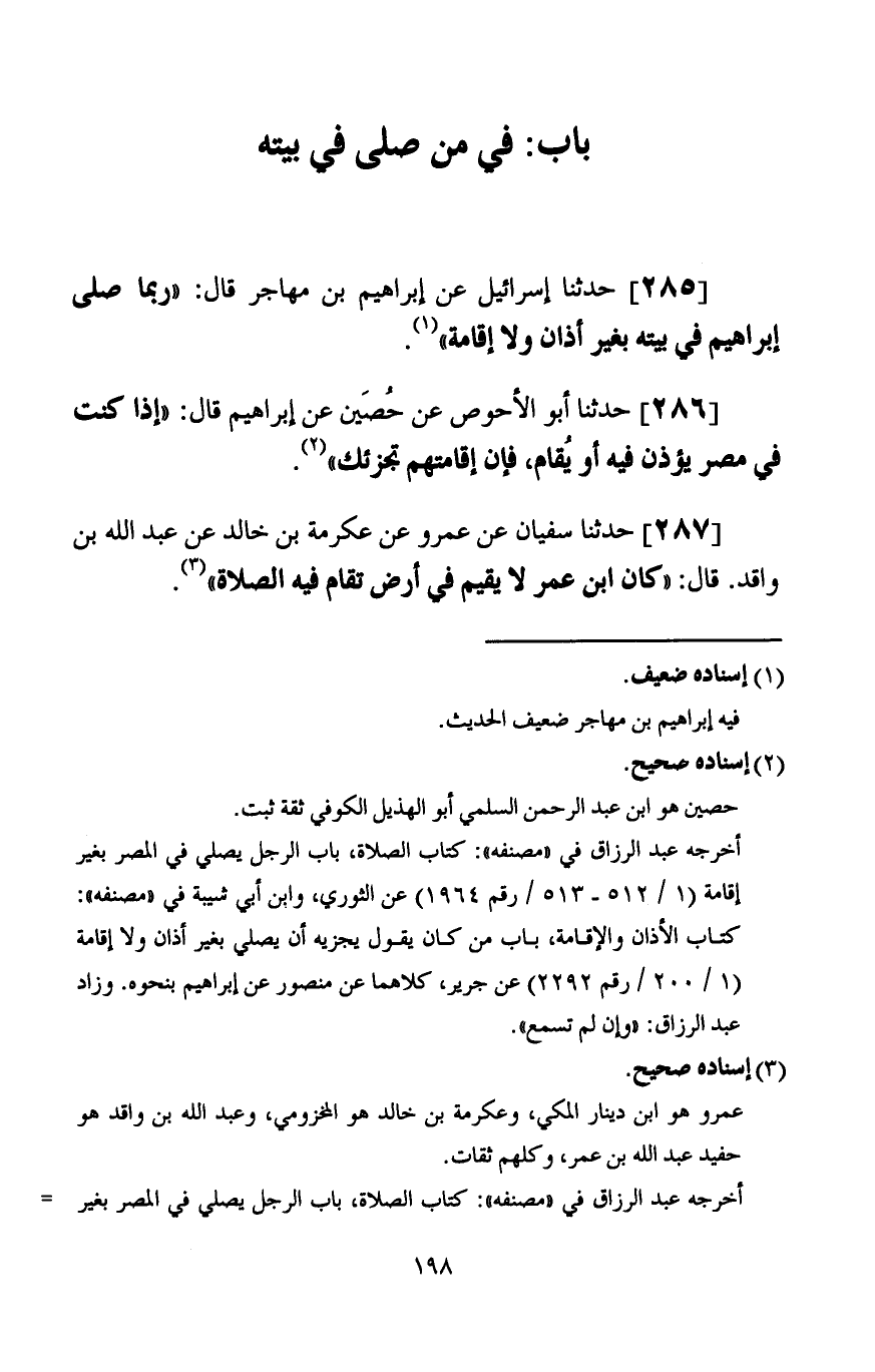 283 - حَدَّثَنَا طَلْحَةُ بْنُ عَمْرٍو، عَنْ عَطَاءٍ، قَالَ: §لَا صَلَاةَ -[197]- إِلَّا بِإِقَامَةٍ