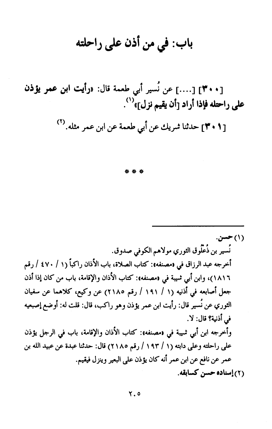 295 - حَدَّثَنَا إِسْرَائِيلُ، قَالَ: حَدَّثَنَا ثُوَيْرٌ، قَالَ: §صَحِبْتُ ابْنَ عُمَرَ فِي سَفَرٍ، وَكَانَ مُؤَذِّنَنَا وَإِمَامَنَا
