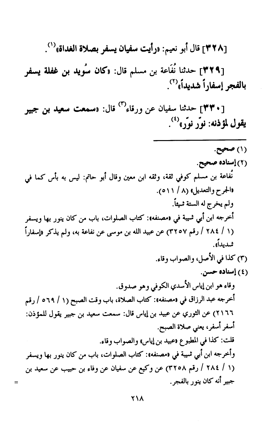 323 - حَدَّثَنَا سُفْيَانُ، عَنْ لَيْثٍ، عَنْ رَجُلٍ، قَالَ: «كَانَ عَلِيٌّ رَضِيَ اللَّهُ عَنْهُ §يُسْفِرُ حَتَّى تَكَادُ الشَّمْسُ تَطْلُعُ»