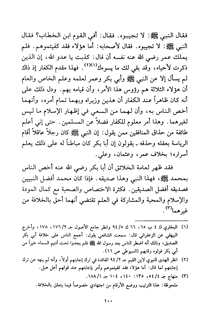 (¬1) البخاري ك 4 ب65، 66 ك5/ 94 وانظر جامع الأصول جـ9/176، 178، وأخرج البيهقي عن الزعفراني قال: سمعت الشافعي يقول: أجمع الناس على خلافة أبي بكر الصديق، وذلك أنه اضطر الناس بعد رسول الله - صلى الله عليه وسلم - فلم يجدوا تحت أديم السماء خيرًا من أبي بكر فولوه رقابهم (السيوطي ص66) .