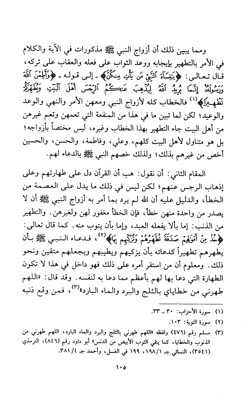 المقام الثاني: أن نقول: هب أن القرآن دل على طهارتهم وعلى إذهاب الرجس عنهم؛ لكن ليس في ذلك ما يدل على العصمة من الخطأ، والدليل عليه أن الله لم يرد بما أمر به أزواج النبي - صلى الله عليه وسلم - ألا يصدر من واحدة منهن خطأ، فإن الخطأ مغفور لهن ولغيرهن، والتطهير من الذنب: إما بألا يفعله العبد، وإما بأن يتوب منه كما قال تعالى: {خُذْ مِنْ أَمْوَالِهِمْ صَدَقَةً تُطَهِّرُهُمْ وَتُزَكِّيهِمْ بِهَا} (¬2) فدعاء النبي - صلى الله عليه وسلم - بأن يطهرهم تطهيرًا كدعائه بأن يزكيهم ويطيبهم ويجعلهم متقين ونحو ذلك. ومعلوم أن من استقر أمره على ذلك فهو داخل في هذا لا تكون الطهارة التي دعا بها لهم بأعظم مما دعا به لنفسه. وقد قال: «اللهم طهرني من خطاياي بالثلج والبرد والماء البارد» (¬3) ، فمن وقع ذنبه