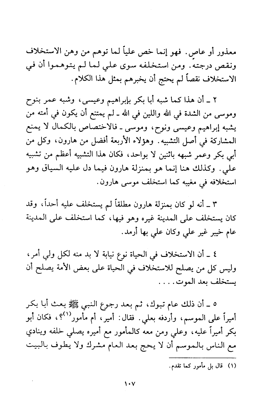 2- أن هذا كما شبه أبا بكر بإبراهيم وعيسى، وشبه عمر بنوح وموسى من الشدة في الله واللين في الله - لم يمتنع أن يكون في أمته من يشبه إبراهيم وعيسى ونوح، وموسى - فالاختصاص بالكمال لا يمنع المشاركة في أصل التشبيه، وهؤلاء الأربعة أفضل من هارون، وكل من أبي بكر وعمر شبهه باثنين لا بواحد، فكان هذا التشبيه أعظم من تشبيه علي. وكذلك هنا إنما هو بمنزلة هارون فيما دل عليه السياق وهو استخلافه في مغيبه كما استخلف موسى هارون.