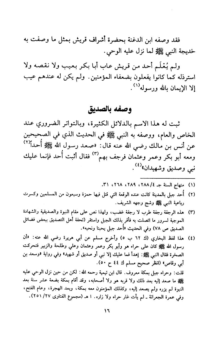 (¬4) هذا لفظ البخاري (ك 62 ب5) وأخرج مسلم عن أبي هريرة رضي الله عنه: «أن رسول الله - صلى الله عليه وسلم - كان على حراء هو وأبو بكر وعمر وعثمان وعلي وطلحة والزبير فتحركت الصخرة فقال النبي - صلى الله عليه وسلم -: اهدأ فما عليك إلا نبي أو صديق أو شهيد» وفي رواية «وسعد بن أبي وقاص» (انظر صحيح مسلم ك44 ح50) .