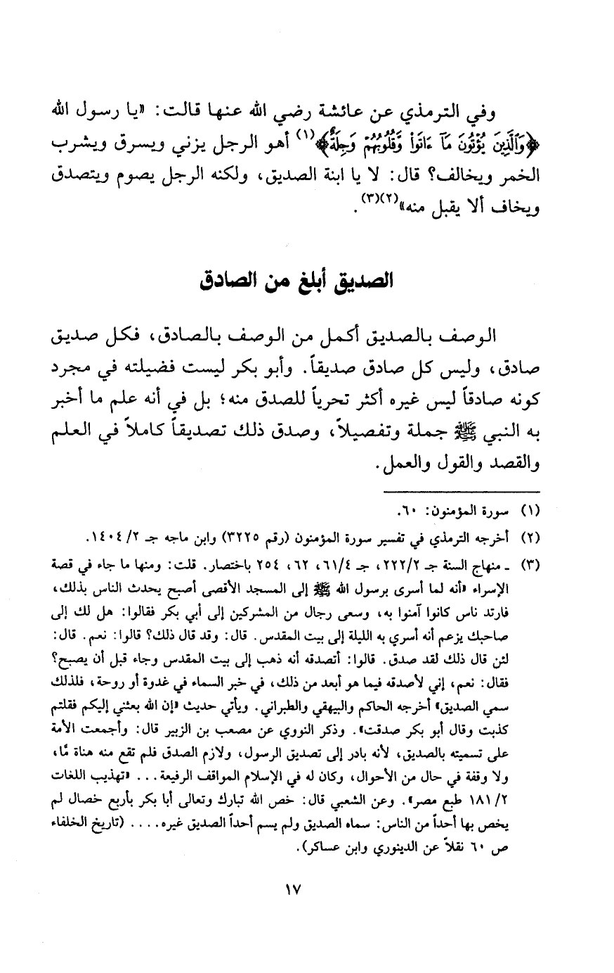 الوصف بالصديق أكمل من الوصف بالصادق، فكل صديق صادق، وليس كل صادق صديقًا. وأبو بكر ليست فضيلته في مجرد كونه صادقًا ليس غيره أكثر تحريًا للصدق منه؛ بل في أنه علم ما أخبر به النبي - صلى الله عليه وسلم - جملة وتفصيلاً، وصدق ذلك تصديقًا كاملاً في العلم والقصد والقول والعمل.