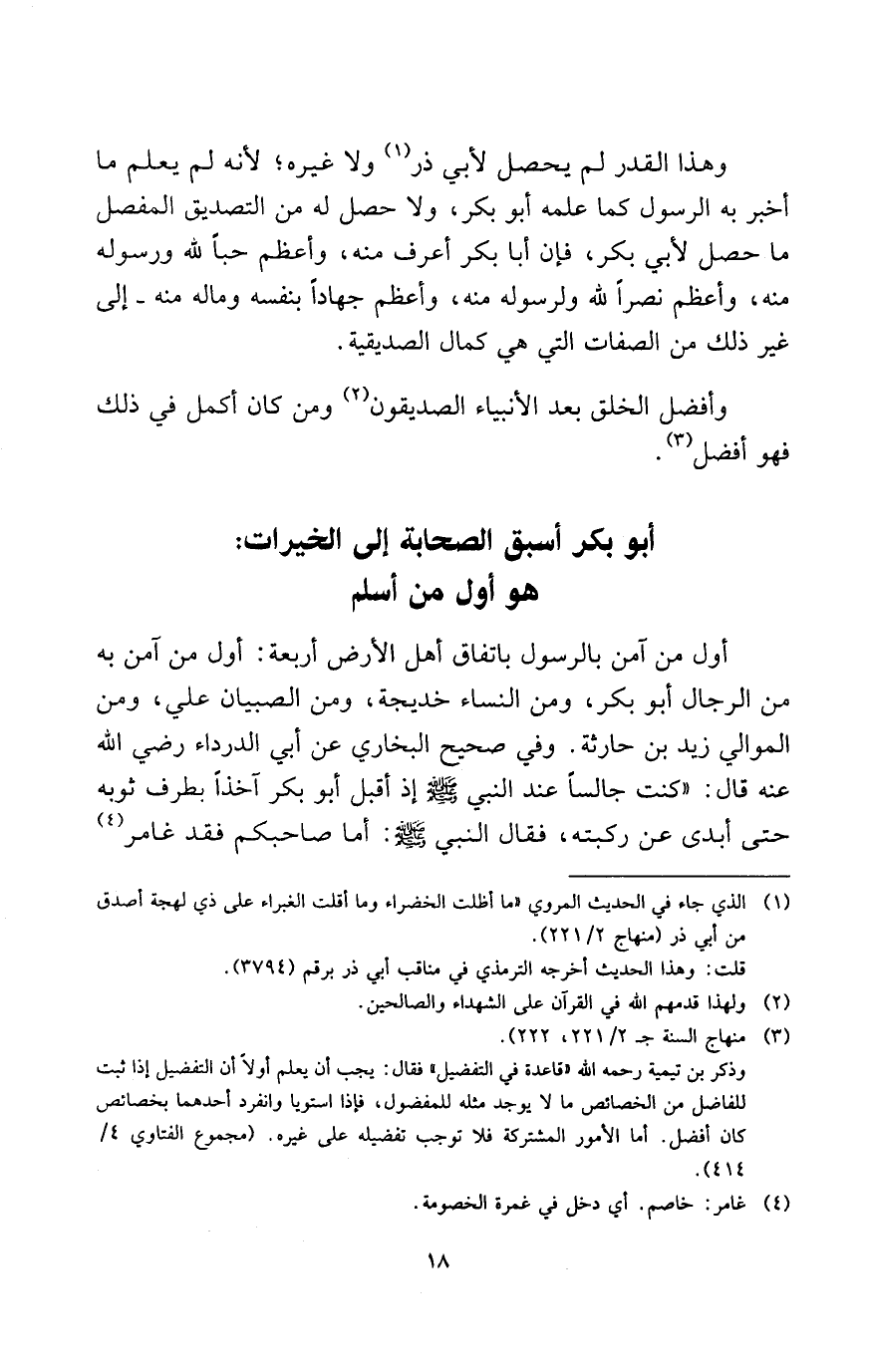 وهذا القدر لم يحصل لأبي ذر (¬1) ولا غيره؛ لأنه لم يعلم ما أخبر به الرسول - صلى الله عليه وسلم - كما علمه أبو بكر، ولا حصل له من التصديق المفصل ما حصل لأبي بكر، ولا حصل له من التصديق المفصل ما حصل لأبي بكر، فإن أبا بكر أعرف منه، وأعظم حبًا لله ورسوله منه، وأعظم نصرًا لله ولرسوله منه، وأعظم جهادًا بنفسه وماله منه، إلى غير ذلك من الصفات التي هي كمال الصديقية.