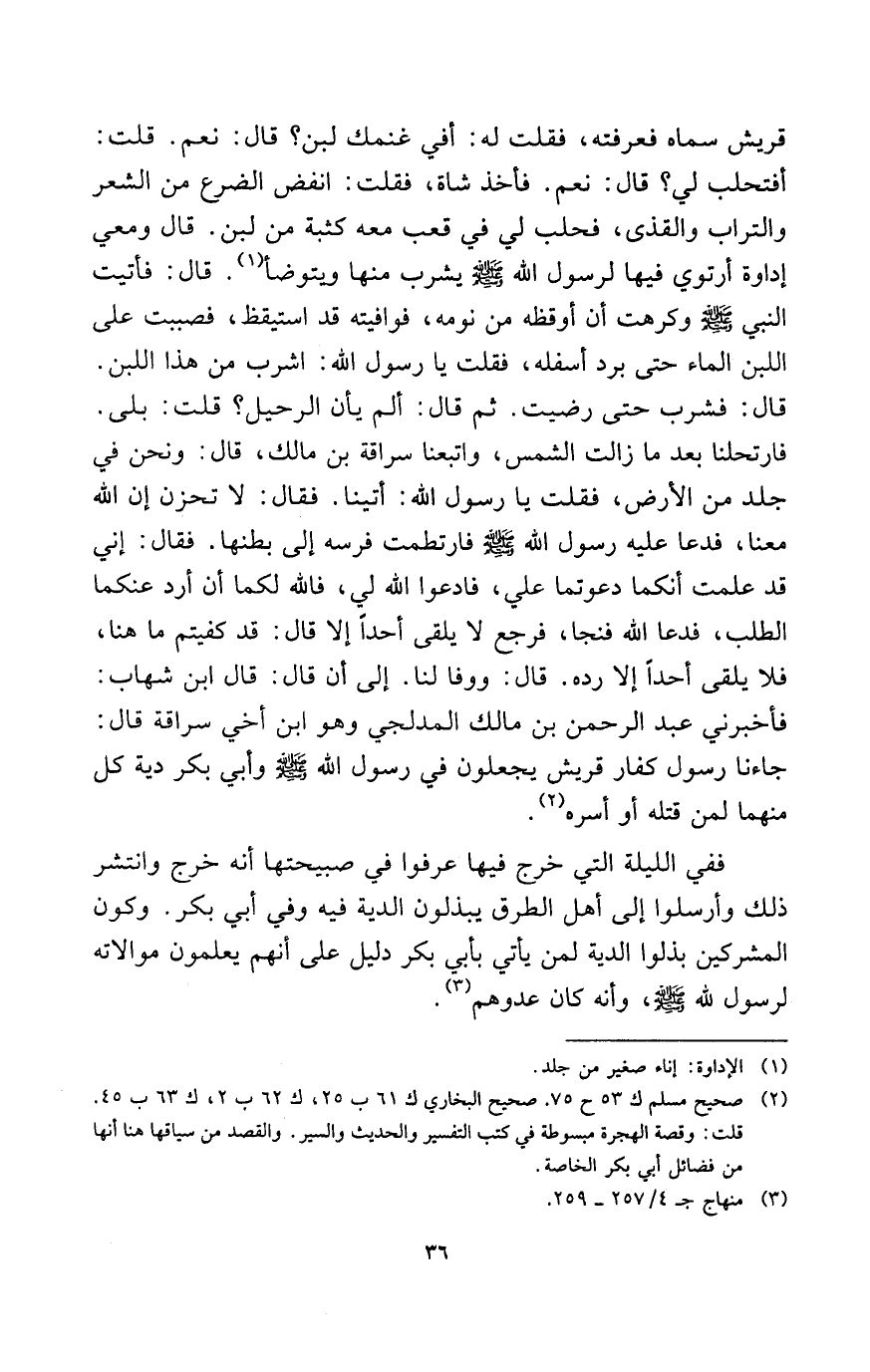 قريش سماه فعرفته، فقلت له: أفي غنمك لبن؟ قال: نعم. قلت: أفتحلب لي؟ قال: نعم فأخذ شاة، فقلت: انفض الضرع من الشعر والتراب والقذى، فحلب لي في قعب معه كثبة من لبن. قال ومعي إداوة أرتوي فيها لرسول الله - صلى الله عليه وسلم - يشرب منها ويتوضأ (¬1) . قال: فأتيت النبي - صلى الله عليه وسلم - وكرهت أن أوقظه من نومه، فوافيته قد استيقظ، فصببت على اللبن الماء حتى برد أسفله، فقلت يا رسول الله: اشرب من هذا اللبن. قال: فشرب حتى رضيت. ثم قال: ألم يأن الرحيل؟ قلت: بلى. فارتحلنا بعد ما زالت الشمس، واتبعنا سراقة بن مالك، قال: ونحن في جلد من الأرض، فقلت يا رسول الله: أتينا. فقال: لا تحزن إن الله معنا، فدعا عليه رسول الله - صلى الله عليه وسلم - فارتطمت فرسه إلى بطنها. فقال: إني قد علمت أنكما دعوتما علي، فادعوا الله لي، فالله لكما أن أرد عنكما الطلب، فدعا الله فنجا، فرجع لا يلقى أحدًا إلا قال: قد كفيتم من هنا، فلا يلقى أحدًا إلا رده. قال: ووفا لنا. إلى أن قال: قال ابن شهاب: فأخبرني عبد الرحمن بن مالك المدجلي وهو ابن أخي سراقة قال: جاءنا رسول كفار قريش يجعلون في رسول الله - صلى الله عليه وسلم - وأبي بكر دية كل منهما لمن قتله أول أسره (¬2) .