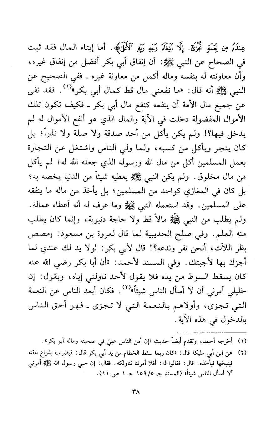 عِنْدَهُ مِنْ نِعْمَةٍ تُجْزَى * إِلا ابْتِغَاءَ وَجْهِ رَبِّهِ الأَعْلَى} . أما إيتاء المال فقد ثبت في الصحاح عن النبي - صلى الله عليه وسلم -: أن إنفاق أبي بكر أفضل من إنفاق غيره، وأن معاونته له بنفسه وماله أكمل من معاونة غيره ففي الصحيح عن النبي أنه قال: «ما نفعني مال قط كمال أبي بكر» (¬1) . فقد نفى عن جميع مال الأمة أن ينفعه كنفع مال أبي بكر فكيف تكون تلك الأموال المفضولة دخلت في الآية والمال الذي هو أنفع الأموال له لم يدخل فيها؟! ولم يكن يأكل من أحد صدقة ولا صلة ولا نذرًا؛ بل كان يتجر ويأكل من كسبه، ولما ولي الناس واشتغل عن التجارة بعمل المسلمين أكل من مال الله ورسوله الذي جعله الله له؛ لم يأكل من مال مخلوق. ولم يكن النبي - صلى الله عليه وسلم - يعطيه شيئًا من الدنيا يخصه به؛ بل كان في المغازي كواحد من المسلمين؛ بل يأخذ من ماله ما ينفقه على المسلمين. وقد استعمله النبي - صلى الله عليه وسلم - وما عرف له أنه أعطاه عمالة. ولم يطلب من النبي - صلى الله عليه وسلم - مالاً قط ولا حاجة دنيوية، وإنما كان يطلب منه العلم. وفي صلح الحديبية لما قال لعروة بن مسعود: امصص بظر اللات، أنحن نفر وندعه؟! قال لأبي بكر: لولا يد لك عندي لما أجزك بها لأجبتك. وفي المسند لأحمد: «أنا أبا بكر رضي الله عنه كان يسقط السوط من يده فلا يقول لأحد ناولني إياه، ويقول: إن خليلي أمرني أن لا أسأل الناس شيئًا» (¬2) . فكان أبعد الناس عن النعمة التي تجزي، وأولاهم بالنعمة التي لا تجزى فهو أحق الناس بالدخول في هذه الآية.