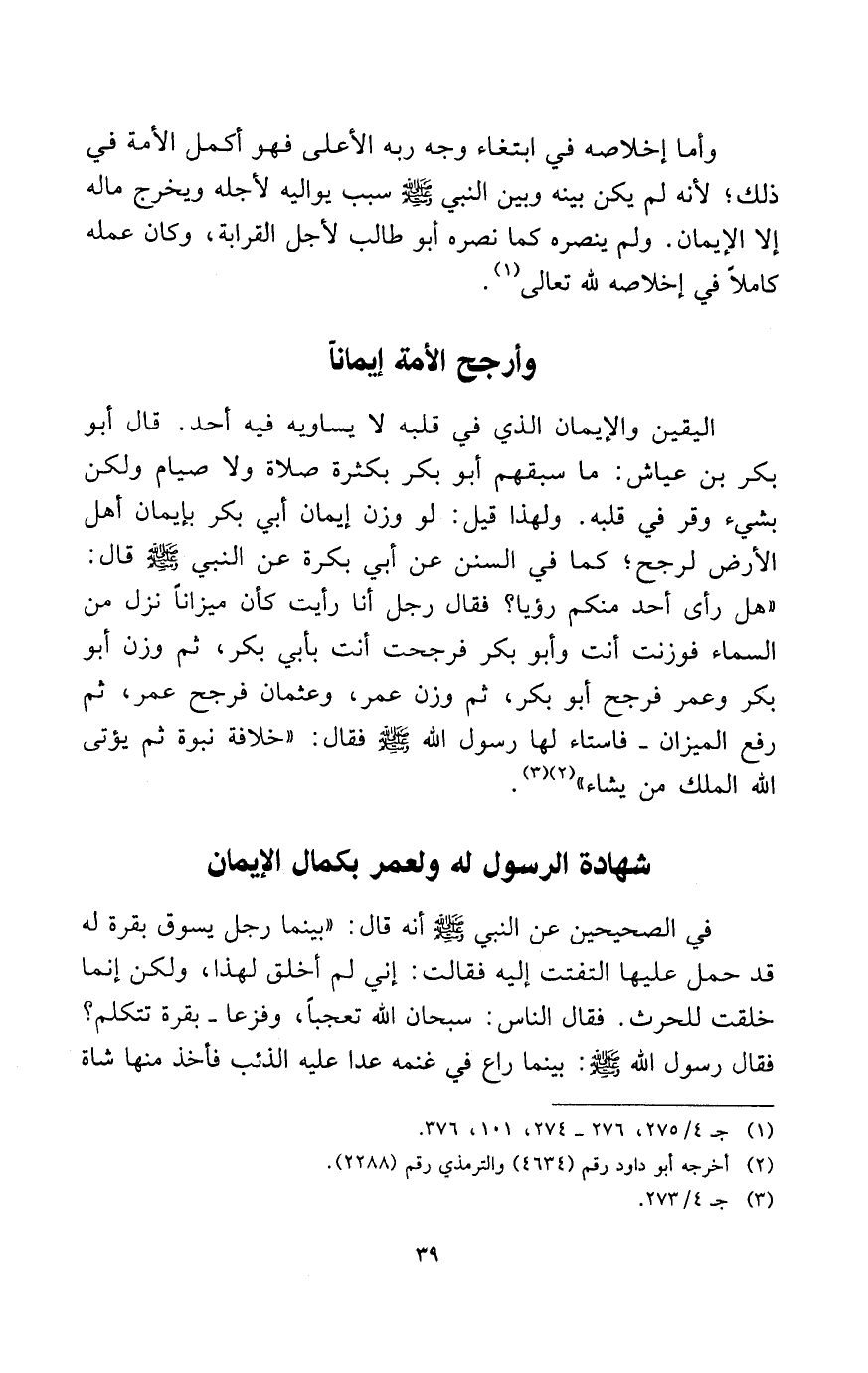 اليقين والإيمان الذي في قلبه لا يساويه فيه أحد، قال أبو بكر بن عياش: ما سبقهم أبو بكر بكثرة صلاة ولا صيام ولكن بشيء وقر في قلبه. ولهذا قيل: لو وزن إيمان أبي بكر بإيمان أهل الأرض لرجح؛ كما في السنن عن أبي بكرة عن النبي - صلى الله عليه وسلم - قال: «هل رأى أحد منكم رؤيا؟ فقال رجل أنا رأيت كأن ميزانًا نزل من السماء فوزنت أنت وأبو بكر فرجحت أنت بأبي بكر، ثم وزن أبو بكر وعمر فرجح أبو بكر، ثم وزن عمر، وعثمان فرجح عمر، ثم رفع الميزان - فاستاء لها رسول الله - صلى الله عليه وسلم - فقال: «خلافة نبوة ثم يؤتي الله الملك من يشاء» (¬2) (¬3) .