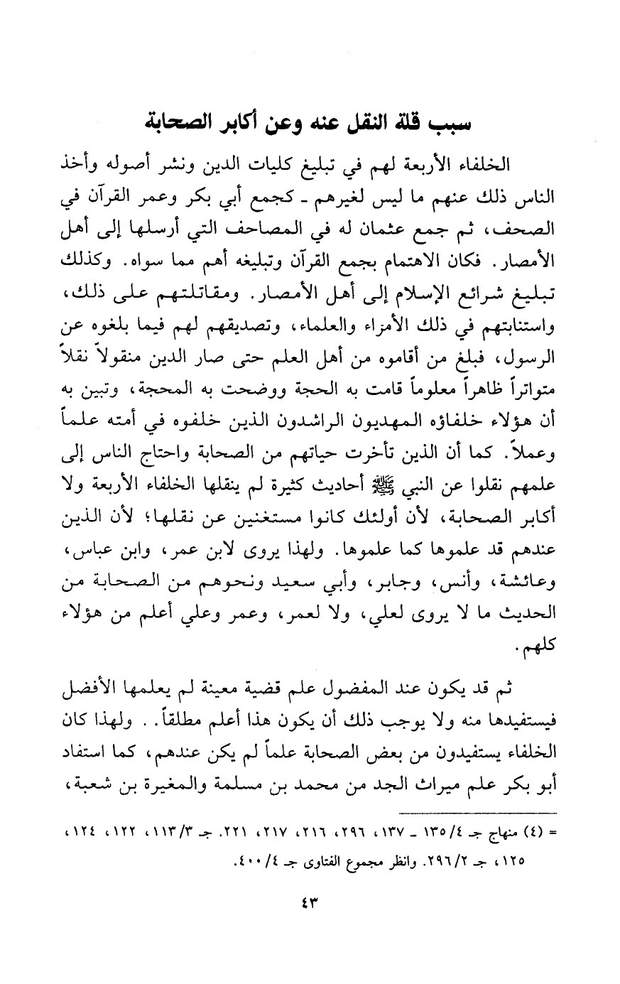 الخلفاء الأربعة لهم في تبليغ كليات الدين ونشر أصوله وأخذ الناس ذلك عنهم ما ليس لغيرهم كجمع أبي بكر وعمر القرآن في الصحف، ثم جمع عثمان له في المصاحف التي أرسلها إلى أهل الأمصار. فكان الاهتمام بجمع القرآن وتبليغه أهم مما سواه. وكذلك تبليغ شرائع الإسلام إلى أهل الأمصار. ومقاتلتهم على ذلك، واستنابتهم في ذلك الأمراء والعلماء، وتصديقهم لهم فيما بلغوه عن الرسول، فبلغ من أقاموه من أهل العلم حتى صار الدين منقولاً نقلاً متواترًا ظاهرًا معلومًا قامت به الحجة ووضحت به المحجة، وتبين به أن هؤلاء خلفاؤه المهديون الراشدون الذين خلفوه في أمته علمًا وعملاً. كما أن الذين تأخرت حياتهم من الصحابة واحتاج الناس إلى علمهم نقلوا عن النبي - صلى الله عليه وسلم - أحاديث كثيرة لم ينقلها الخلفاء الأربعة ولا أكابر الصحابة، لأن أولئك كانوا مستغنين عن نقلها؛ لأن الذين عندهم قد علموها كما علموها. ولهذا يروى لابن عمر، وابن عباس، وعائشة، وأنس، وجابر، وأبي سعيد ونحوهم من الصحابة من الحديث ما لا يروى لعلي، ولا لعمر، وعمر وعلي أعمل من هؤلاء كلهم.