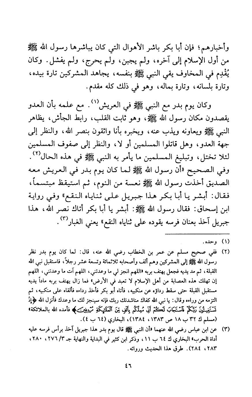 (¬3) عن ابن عباس رضي الله عنهما «أن النبي - صلى الله عليه وسلم - قال: يوم بدر هذا جبريل آخذ برأس فرسه عليه أداة الحرب» ، البخاري ك64 ب11، وذكر ابن كثير في البداية والنهاية جـ3/ 276، 280، 283، 284) طرق هذا الحديث ورواته.