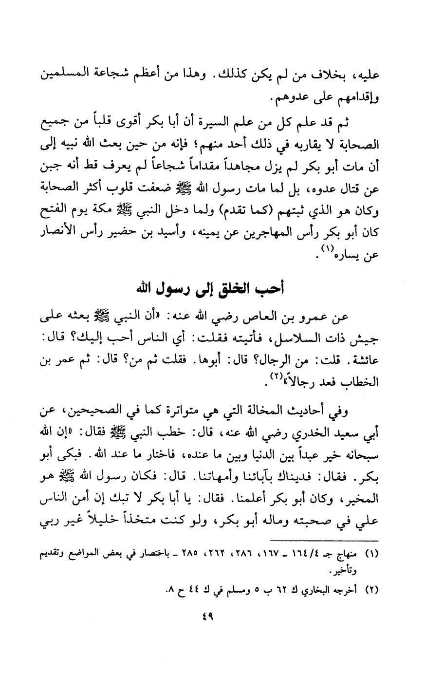 وفي أحاديث المخالة التي هي متواترة كما في الصحيحين، عن أبي سعيد الخدري رضي الله عنه، قال: خطب النبي - صلى الله عليه وسلم - فقال: «إن الله سبحانه خير عبدًا بين الدنيا وبين ما عنده، فاختار ما عند الله. فبكى أبو بكر. فقال: فديناك بآبائنا وأمهاتنا. قال: فكان رسول الله - صلى الله عليه وسلم - هو المخير، وكان أبو بكر أعلمنا، فقال: يا أبا بكر لا تبك إن أمن الناس علي في صحبته وماله أبو بكر، ولو كنت متخذًا خليلاً غير ربي