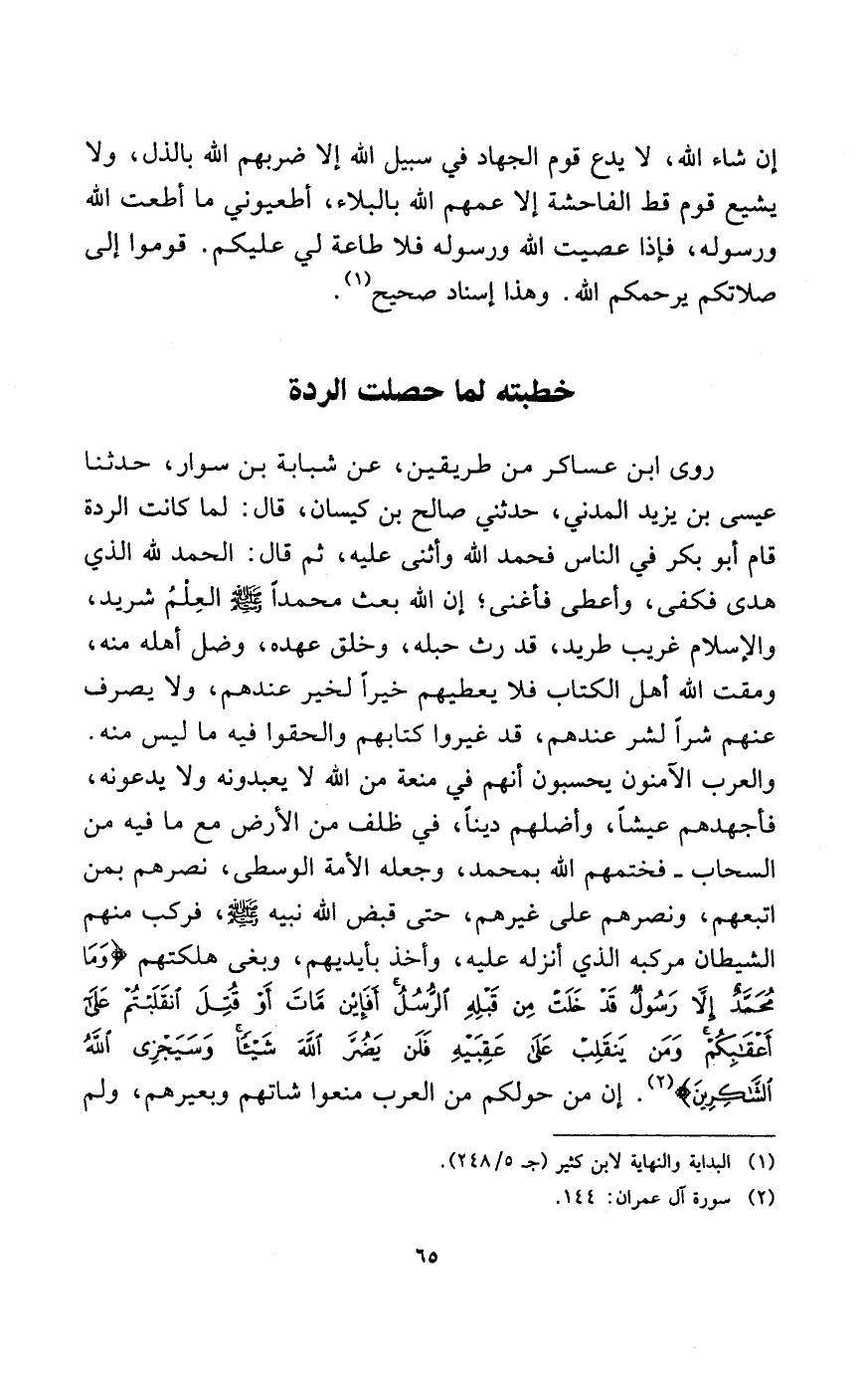 روى ابن عساكر من طريقين، عن شبابة بن سوار، حدثنا عيسى بن يزيد المدني، حدثني صالح بن كيسان، قال: لما كانت الردة قام أبو بكر في الناس فحمد الله وأثنى عليه، ثم قال: الحمد لله الذي هدى فكفى، وأعطى فأغنى؛ إن الله بعث محمدًا - صلى الله عليه وسلم - العلم شريد، والإسلام غريب طريد، قد رث حبله، وخلق عهده، وضل أهله منه، ومقت الله أهل الكتاب فلا يعطيهم خيرًا لخير عندهم، ولا يصرف عنهم شرًا لشر عندهم، قد غيروا كتابهم وألحقوا فيه ما ليس منه، والعرب الآمنون يحسبون أنهم في منعة من الله لا يعبدونه ولا يدعونه، فأجهدهم عيشًا، وأضلهم دينًا، في ظلف من الأرض مع ما فيه من السحاب فختمهم الله بمحمد، وجعله الأمة الوسطى، نصرهم بمن اتبعهم، ونصرهم على غيرهم، حتى قبض الله نبيه - صلى الله عليه وسلم -، فركب منهم الشيطان مركبه الذي أنزله عليه، وأخذ بأيديهم، وبغى هلكتهم {وَمَا مُحَمَّدٌ إِلا رَسُولٌ قَدْ خَلَتْ مِنْ قَبْلِهِ الرُّسُلُ أَفَإِنْ مَاتَ أَوْ قُتِلَ انْقَلَبْتُمْ عَلَى أَعْقَابِكُمْ وَمَنْ يَنْقَلِبْ عَلَى عَقِبَيْهِ فَلَنْ يَضُرَّ اللهَ شَيْئًا وَسَيَجْزِي اللهُ الشَّاكِرِينَ} (¬2) . إن من حولكم من العرب منعوا شتاهم وبعيرهم، ولم يكونوا في دينهم وإن رجعوا إليه أزهد منهم يومهم هذا، ولم