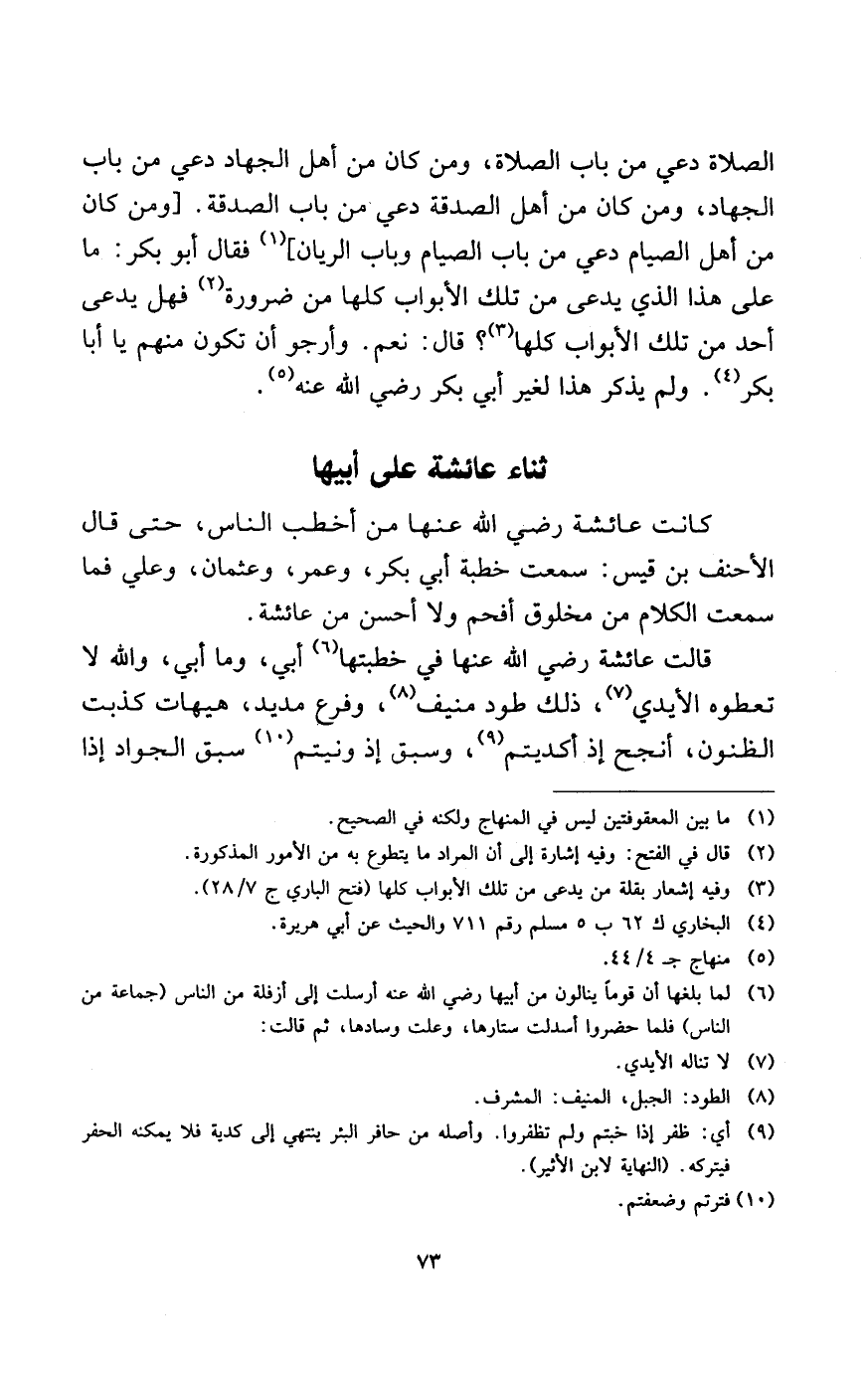 الصلاة دعي من باب الصلاة، ومن كان من أهل الجهاد دعي من باب الجهاد، ومن كان من أهل الصدقة دعي من باب الصدقة، [ومن كان من أهل الصيام دعي من باب الصيام وباب الريان] (¬1) فقال أبو بكر: ما على هذا الذي يدعى من تلك الأبواب كلها من ضرورة (¬2) فهل يدعى أحد من تلك الأبواب كلها (¬3) ؟ قال نعم. وأرجو أن تكون منهم يا أبا بكر (¬4) . ولم يذكر هذا لغير أبي بكر رضي الله عنه» (¬5) .