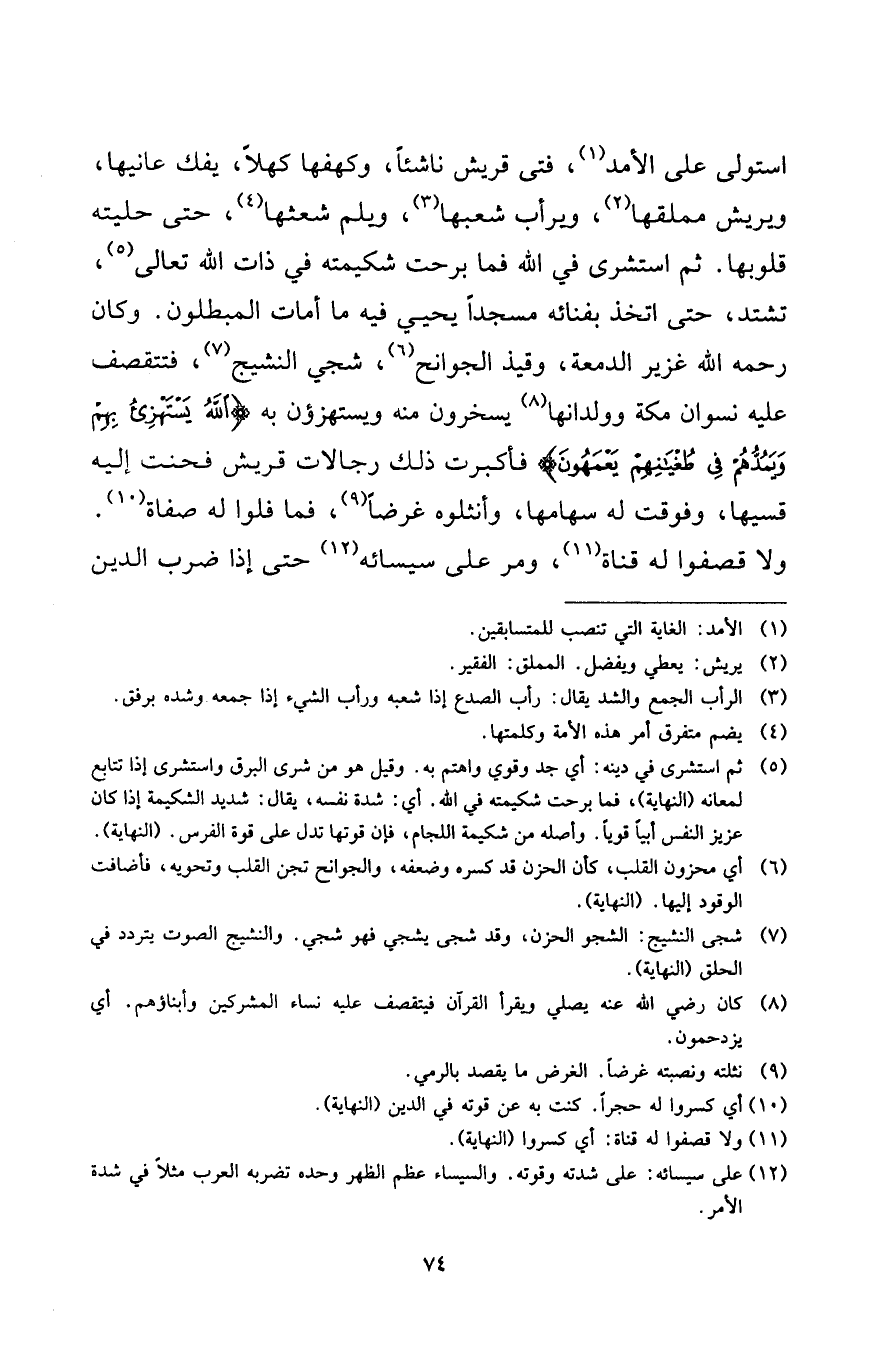 (¬5) ثم استشرى في دينه: أي جد وقوي واهتم به. وقيل هو من شرى البرق واستشرى إذا تتابع لمعانه (النهاية) ، فما برحت شكيمته في الله، أي: شدة نفسه، يقال: شديد الشكيمة إذا كان عزيز النفس أبيًا قويًا، وأصله من شكيمة اللجام، فإن قوتها تدل على قوة الفرس. (النهاية) .