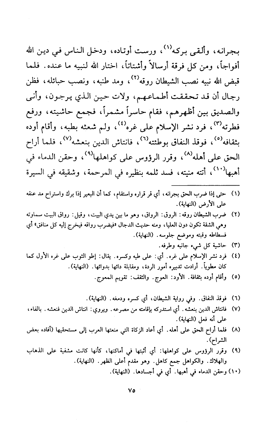 (¬4) فرد نشر الإسلام على غره، أي: على طيه وكسره. يقال: اطو الثوب على غره الأول كما كان مطويًا. أرادت تدبيره أمور الردة، ومقابلة دائها بدوائها. (النهاية) .