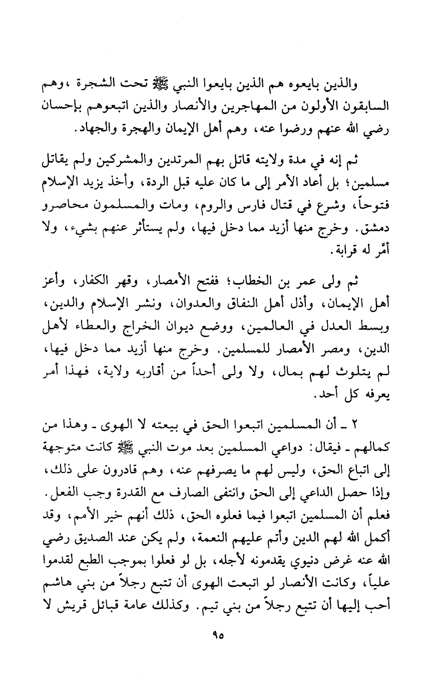 2- أن المسلمين اتبعوا الحق في بيعته لا الهوى وهذا من كمالهم فيقال: دواعي المسلمين بعد موت النبي - صلى الله عليه وسلم - كانت متوجهة إلى اتباع الحق، وليس لهم ما يصرفهم عنه وهم قادرون على ذلك، وإذا حصل الداعي إلى الحق وانتفى الصارف مع القدرة وجب الفعل. فعلم أن المسلمين اتبعوا فيما فعلوه الحق، ذلك أنهم خير الأمم، وقد أكمل الله لهم الدين وأتم عليهم النعمة، ولم يكن عند الصديق رضي الله عنه غرض دنيوي يقدمونه لأجله، بل لو فعلوا بموجب الطبع لقدموا عليًا، وكانت الأنصار لو اتبعت الهوى أن تتبع رجلاً من بني هاشم أحب إليها أن تتبع رجلاً من بني تيم، وكذلك عامة قبائل قريش لا