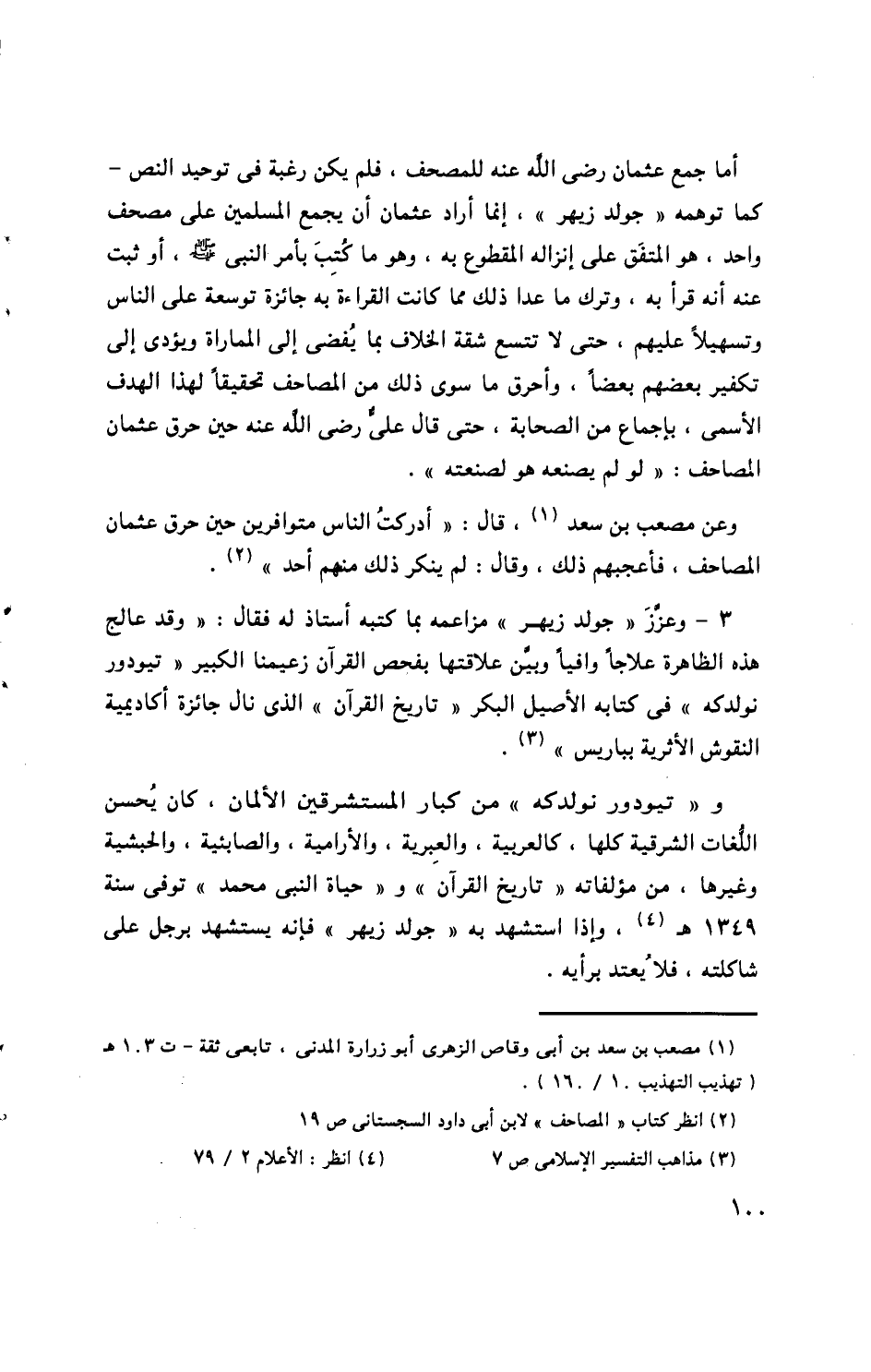 3 - وعزّز «جولد زيهر» مزاعمه بما كتبه أستاذ له فقال: «وقد عالج هذه الظاهرة علاجا وافيا وبيّن علاقتها بفحص القرآن زعيمنا الكبير «تيودور نولدكه» فى كتابه الأصيل البكر «تاريخ القرآن» الذى نال جائزة أكاديمية النقوش الأثرية بباريس» «3».