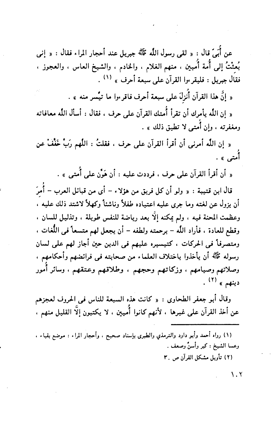 وقال أبو جعفر الطحاوى: «كانت هذه السبعة للناس فى الحروف لعجزهم عن أخذ القرآن على غيرها، لأنهم كانوا أميين، لا يكتبون إلّا القليل منهم،