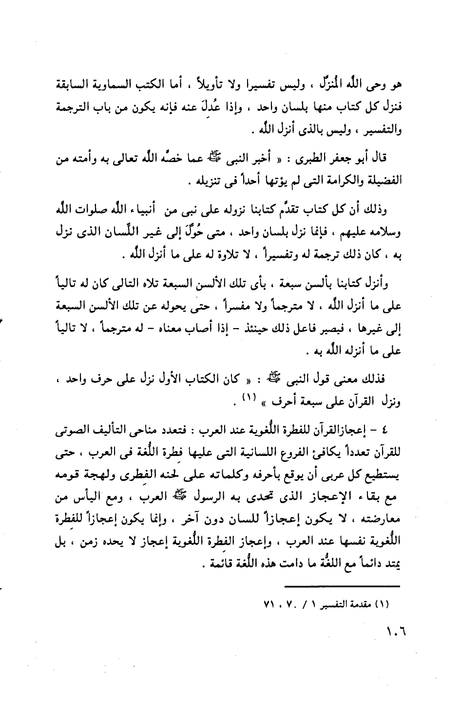 وأنزل كتابنا بألسن سبعة، بأى تلك الألسن السبعة تلاه التالى كان له تاليا على ما أنزل الله، لا مترجما ولا مفسرا، حتى يحوله عن تلك الألسن السبعة إلى غيرها، فيصير فاعل ذلك حينئذ- إذا أصاب معناه- له مترجما، لا تاليا على ما أنزله الله به.
