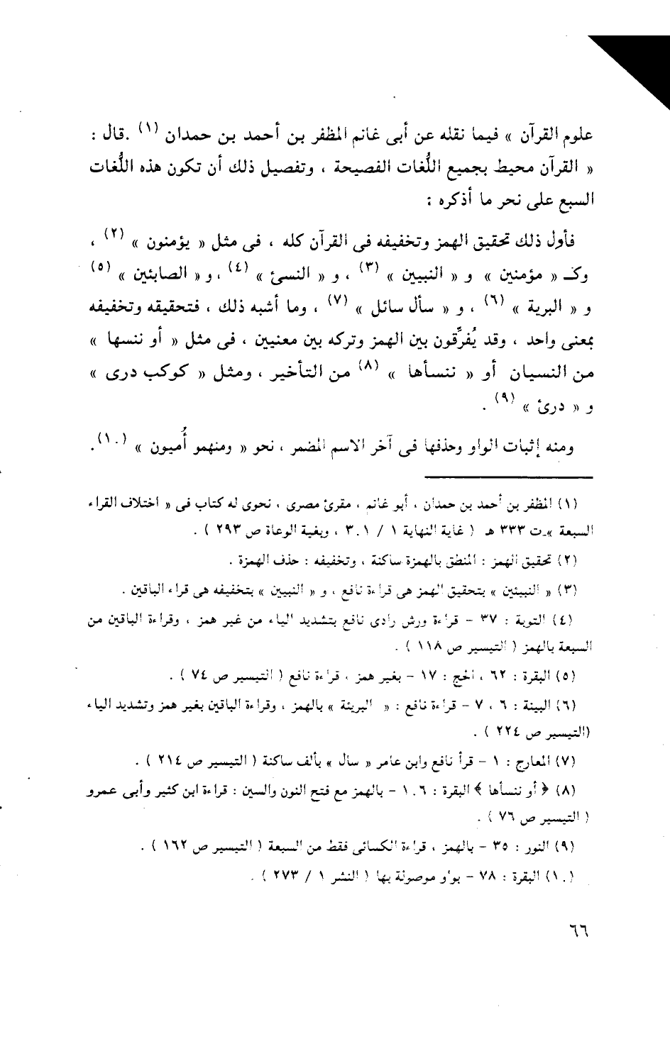 علوم القرآن» فيما نقله عن أبى غانم المظفر بن أحمد بن حمدان «1». قال: