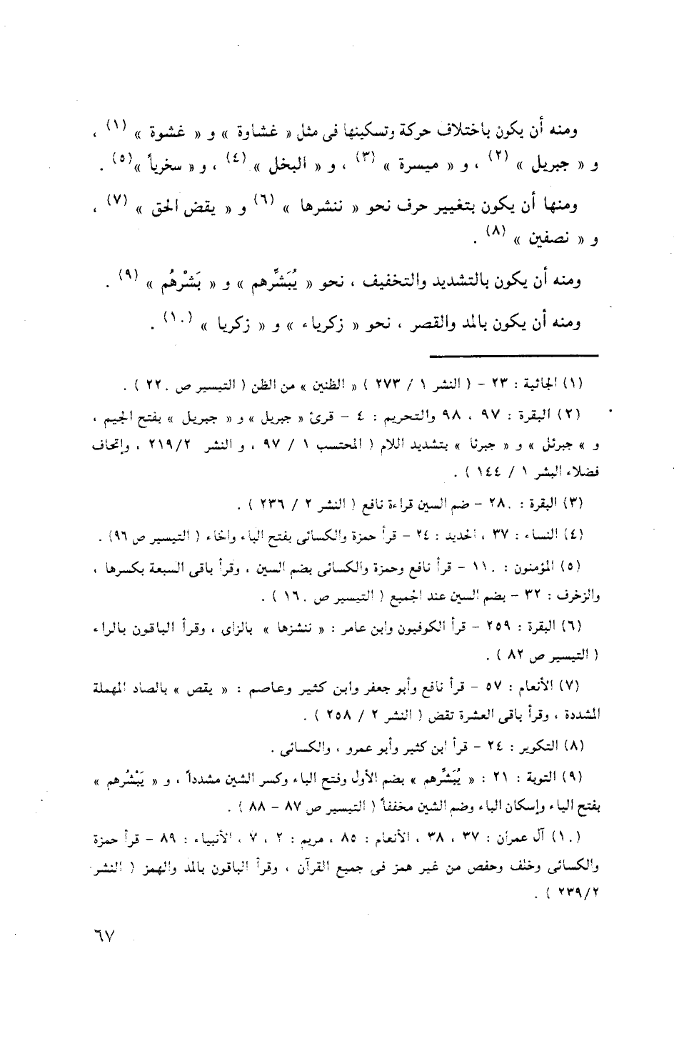 ومنه أن يكون باختلاف حركة وتسكينها فى مثل «غشاوة» و «غشوة» «1»، و «جبريل» «2»، و «ميسرة» «3»، و «البخل» «4»، و «سخريا» «5».