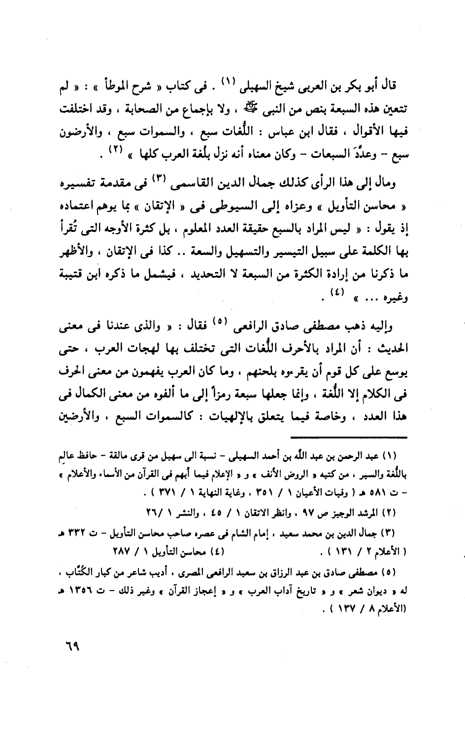 وإليه ذهب مصطفى صادق الرافعى «5» فقال: «والذى عندنا فى معنى الحديث: أن المراد بالأحرف اللّغات التى تختلف بها لهجات العرب، حتى يوسع على كل قوم أن يقرءوه بلحنهم، وما كان العرب يفهمون من معنى الحرف فى الكلام إلا اللّغة، وإنما جعلها سبعة رمزا إلى ما ألفوه من معنى الكمال فى هذا العدد، وخاصة فيما يتعلق بالإلهيات: كالسماوات السبع، والأرضين