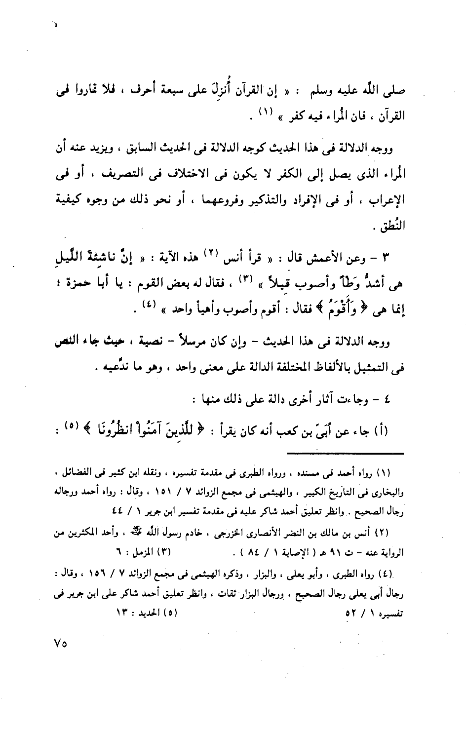 ووجه الدلالة فى هذا الحديث كوجه الدلالة فى الحديث السابق، ويزيد عنه أن المراة الذى يصل إلى الكفر لا يكون فى الاختلاف فى التصريف، أو فى الإعراب، أو فى الإفراد والتذكير وفروعهما، أو نحو ذلك من وجوه كيفية النطق.