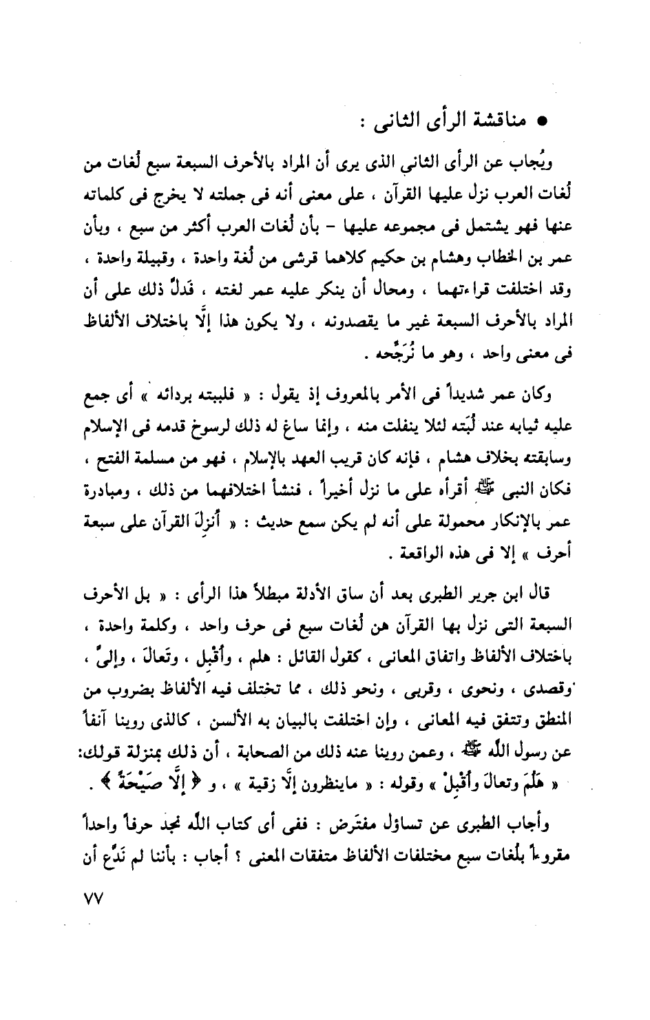ويجاب عن الرأى الثانى الذى يرى أن المراد بالأحرف السبعة سبع لغات من لغات العرب نزل عليها القرآن، على معنى أنه فى جملته لا يخرج فى كلماته عنها فهو يشتمل فى مجموعه عليها- بأن لغات العرب أكثر من سبع، وبأن عمر بن الخطاب وهشام بن حكيم كلاهما قرشى من لغة واحدة، وقبيلة واحدة، وقد اختلفت قراءتهما، ومحال أن ينكر عليه عمر لغته، فدلّ ذلك على أن المراد بالأحرف السبعة غير ما يقصدونه، ولا يكون هذا إلّا باختلاف الألفاظ فى معنى واحد، وهو ما نرجّحه.