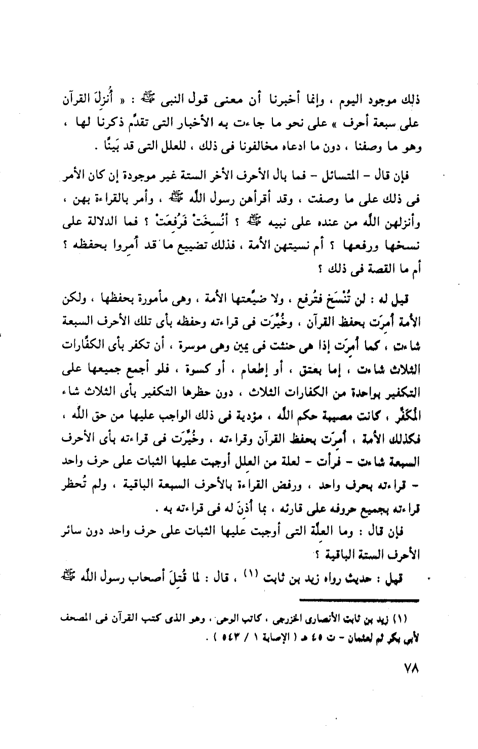 فإن قال- المتسائل- فما بال الأحرف الأخر الستة غير موجودة إن كان الأمر فى ذلك على ما وصفت، وقد أقرأهن رسول الله صلّى الله عليه وسلم، وأمر بالقراءة بهن، وأنزلهن الله من عنده على نبيه صلّى الله عليه وسلم؟ أنسخت فرفعت؟ فما الدلالة على نسخها ورفعها؟ أم نسيتهن الامة، فذلك تضييع ما قد أمروا بحفظه؟