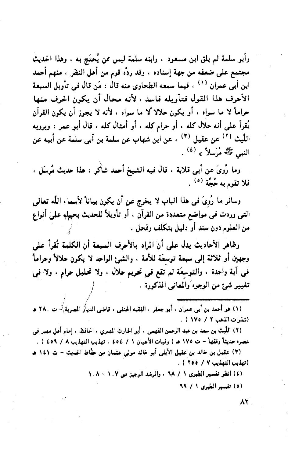 وظاهر الأحاديث يدل على أن المراد بالأحرف السبعة أن الكلمة تقرأ على وجهين أو ثلاثة إلى سبعة توسعة للأمة، والشيء الواحد لا يكون حلالا وحراما فى آية واحدة، والتوسعة لم تقع فى تحريم حلال، ولا تحليل حرام، ولا فى تغيير شىء من الوجوه والمعانى المذكورة.