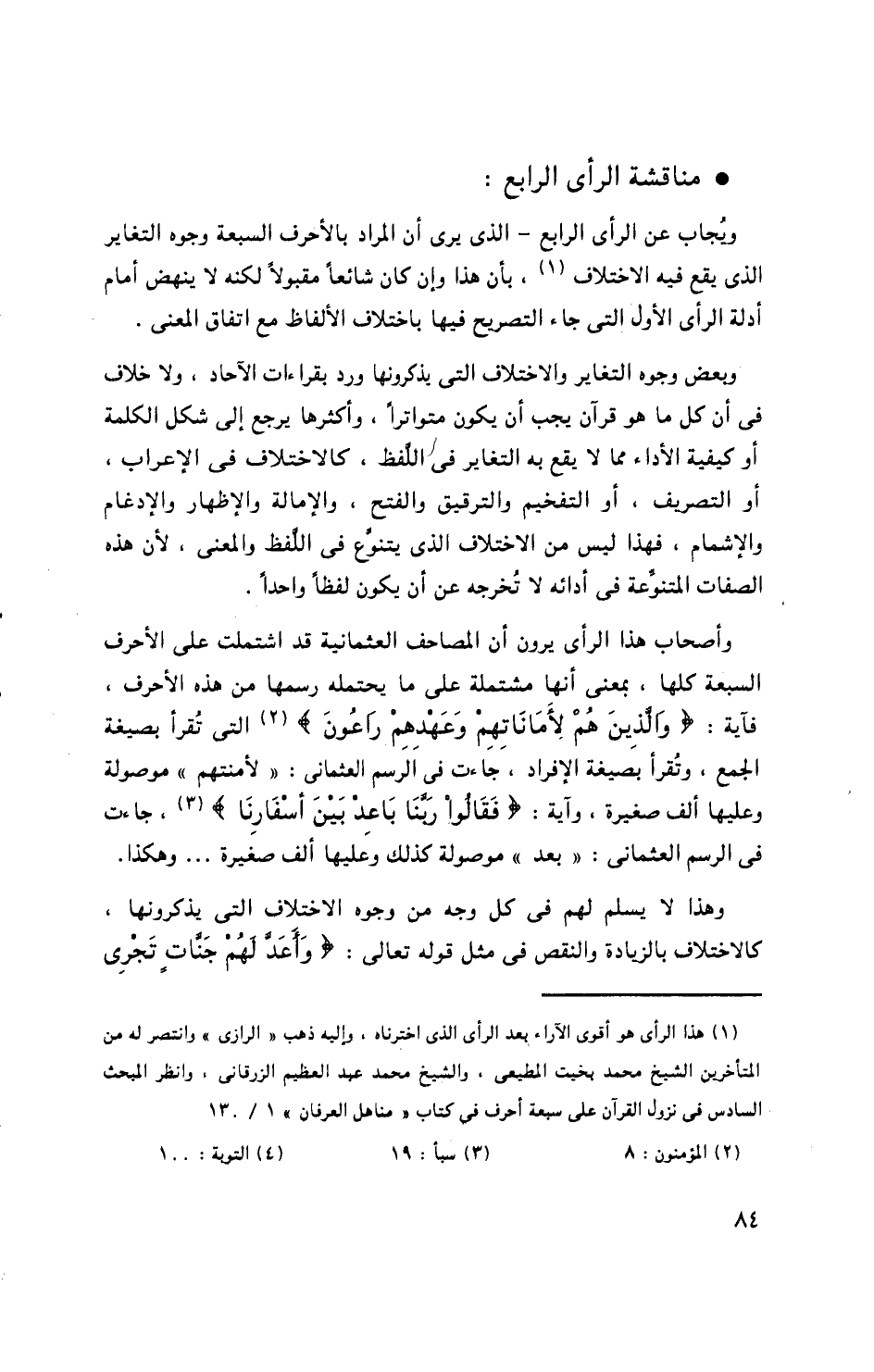 وأصحاب هذا الرأى يرون أن المصاحف العثمانية قد اشتملت على الأحرف السبعة كلها، بمعنى أنها مشتملة على ما يحتمله رسمها من هذه الأحرف، فآية: وَالَّذِينَ هُمْ لِأَماناتِهِمْ وَعَهْدِهِمْ راعُونَ «2» التى تقرأ بصيغة الجمع، وتقرأ بصيغة الإفراد، جاءت فى الرسم العثمانى: «لأمنتهم» موصولة وعليها ألف صغيرة، وآية: فَقالُوا رَبَّنا باعِدْ بَيْنَ أَسْفارِنا «3»، جاءت فى الرسم العثمانى: «بعد» موصولة كذلك وعليها ألف صغيرة ... وهكذا.