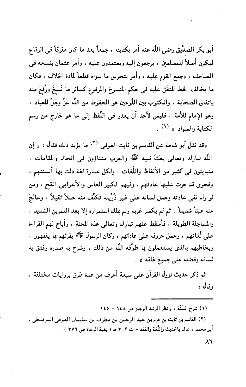أبو بكر الصدّيق رضى الله عنه أمر بكتابته، جمعا بعد ما كان مفرقا فى الرقاع ليكون أصلا للمسلمين، يرجعون إليه ويعتمدون عليه، وأمر عثمان بنسخه فى المصاحف، وجمع القوم عليه، وأمر بتحريق ما سواه قطعا لمادة الخلاف، فكان ما يخالف الخط المتفق عليه فى حكم المنسوخ والمرفوع كسائر ما نسخ ورفع منه باتفاق الصحابة، والمكتوب بين اللّوحين هو المحفوظ من الله عزّ وجلّ للعباد، وهو الإمام للأمة، فليس لأحد أن يعدو فى اللّفظ إلى ما هو خارج من رسم الكتابة والسواد» «1».