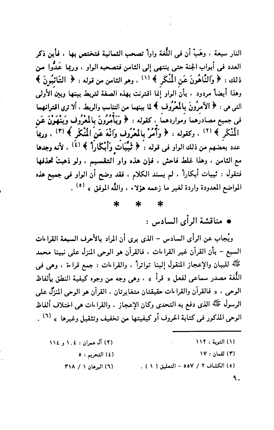 النار سبعة، وهب أن فى اللّغة واوا تصحب الثمانية فتختص بها، فأين ذكر العدد فى أبواب الجنة حتى ينتهى إلى الثامن فتصحبه الواو، وربما عدوّا من ذلك: وَالنَّاهُونَ عَنِ الْمُنْكَرِ «1»، وهو الثامن من قوله: التَّائِبُونَ وهذا أيضا مردود، بأن الواو إنما اقترنت بهذه الصفة لتربط بينها وبين الأولى التى هى: الْآمِرُونَ بِالْمَعْرُوفِ لما بينهما من التناسب والربط، ألا ترى اقترانهما فى جميع مصادرهما ومواردهما، كقوله: وَيَأْمُرُونَ بِالْمَعْرُوفِ وَيَنْهَوْنَ عَنِ الْمُنْكَرِ «2»، وكقوله: وَأْمُرْ بِالْمَعْرُوفِ وَانْهَ عَنِ الْمُنْكَرِ «3»، وربما عدد بعضهم من ذلك الواو فى قوله: ثَيِّباتٍ وَأَبْكاراً «4»، لأنه وجدها مع الثامن، وهذا غلط فاحش، فإن هذه واو التقسيم، ولو ذهبت تحذفها فتقول: ثيبات أبكارا، لم يسند الكلام، فقد وضح أن الواو فى جميع هذه المواضع المعدودة واردة لغير ما زعمه هؤلاء، والله الموفق» «5».
