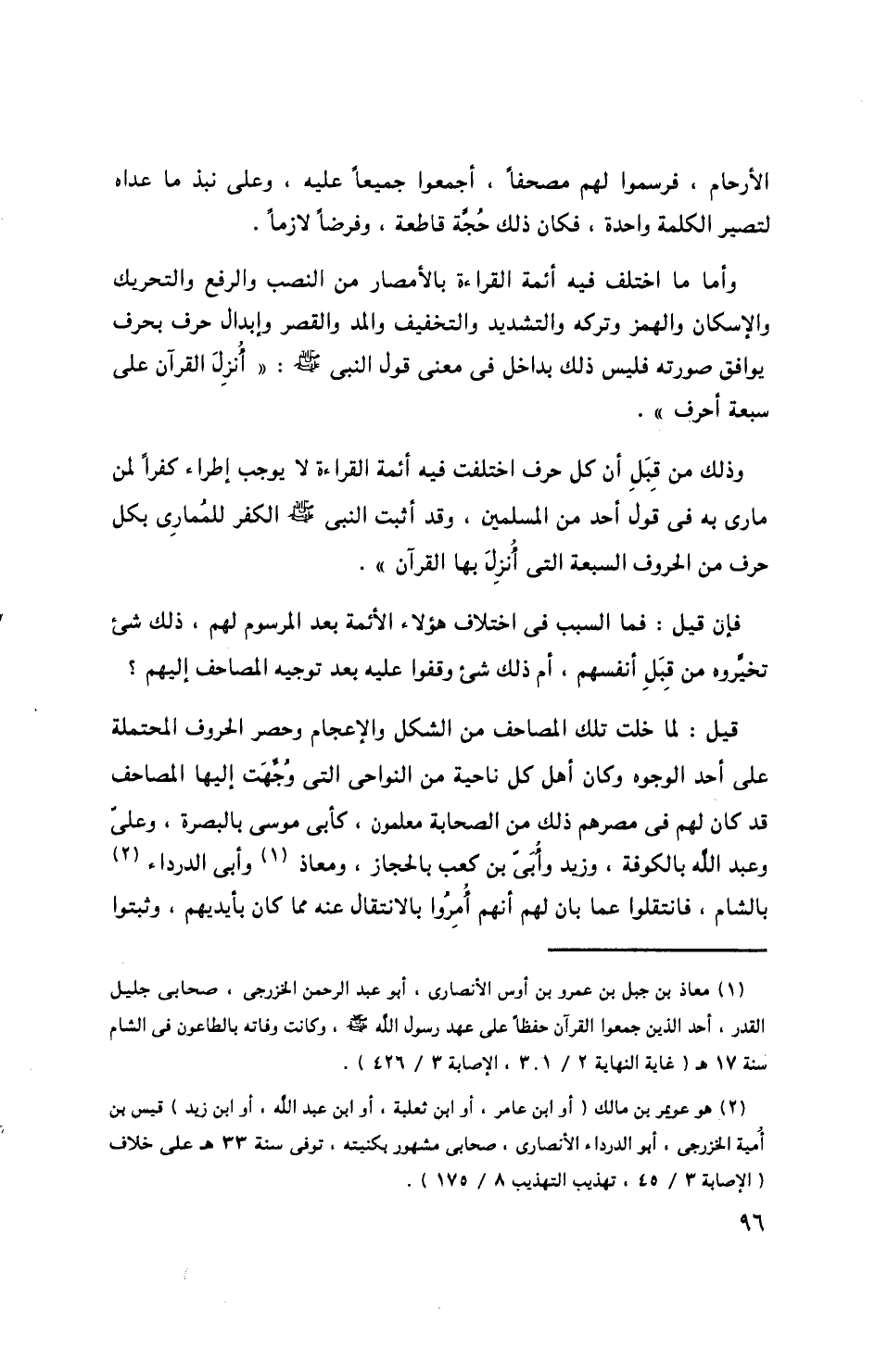 وذلك من قبل أن كل حرف اختلفت فيه أئمة القراءة لا يوجب إطراء كفرا لمن مارى به فى قول أحد من المسلمين، وقد أثبت النبى صلّى الله عليه وسلم الكفر للممارى بكل حرف من الحروف السبعة التى أنزل بها القرآن».