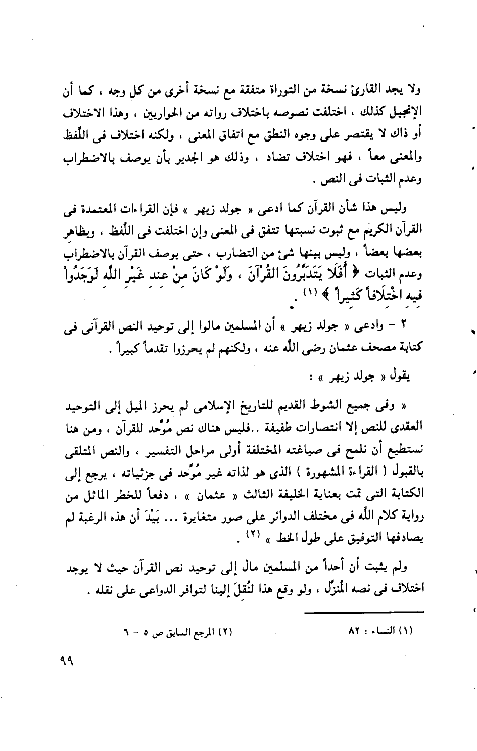 وليس هذا شأن القرآن كما ادعى «جولد زيهر» فإن القراءات المتعمدة فى القرآن الكريم مع ثبوت نسبتها تتفق فى المعنى وإن اختلفت فى اللّفظ، ويظاهر بعضها بعضا، وليس بينها شىء من التضارب، حتى يوصف القرآن بالاضطراب وعدم الثبات أَفَلا يَتَدَبَّرُونَ الْقُرْآنَ، وَلَوْ كانَ مِنْ عِنْدِ غَيْرِ اللَّهِ لَوَجَدُوا فِيهِ اخْتِلافاً كَثِيراً «1».