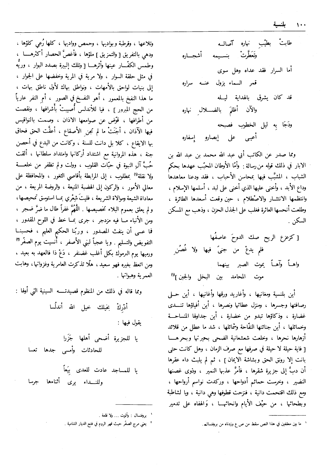 واهاً وآهاً يموت الصبر بينهما ... (1) موت المحامد ببن البخل والجبن أين بلنسية ومغانيها، وأغاريد ورقها وأغانيها، أين حلى رصافتها وجسرها، ومنزل عطائها ونصرها، أين أفياؤها تندى غضارة، وذكاؤها تبدو من خضارة، أين جداولها المنساحة وخمائلها، أين جنائنها النفاحة وشمائلها، شد ما عطل من قلائد أزهارها نحرها، وخلعت شعشعانية الضحى بحيرتها وبحرها فأية حيلة لا حيلة في صرفها مع صرف الزمان، وهل كانت حتى بانت إلا رونق الحق وبشاشة الإيمان،، ثم لم يلبث داء عقرها أن دب إلى جزيرة شقرها، فأمر عذبها النمير، وذوى غصنها النضير، وخرست حمائم أدواحها، وركدت نواسم أرواحها، ومع ذلك اقتحمت دانية، فنزحت قطوفها وهي دانية،،ويا لشاطبة وبطحائها، من حيف الأيام وأنحائها، والهفاه على تدمير وتلاعها، وقرطبة وبواديها، وحمص وواديها، كلها رعي كلؤها ودهي بالتفريق والتمزيق ملؤها، فأغص الحصار أكثرها، وطمس الكفار عينها وأثرها وتلك إلبيرة بصدد البوار، وريه في مثل حلقة السوار، ولا مرية في المرية وخفضها على الجوار، إلى بنيات لواحق بالأمهات، ونواطق بهاك لأول ناطق بهات، ما هذا النفخ بالمعمور، أهو النفخ في الصور، أم النفر عارياً من الحج المبرور فيا للأندلس أصيبت بأشرافها، ونقصت من أطرافها، قوض عن صوامعها الأذان، وصمت بالنواقيس فيها الأذان، أجنت ما لم تجن الأصقاع، أعقت الحق فحاق بها الإيقاع، كلا بل دانت للسنة، وكانت من البدع في أحصن جنة، هذه المروانية مع اشتداد أركانها وامتداد سلطانها، ألقت حب آل النبوة في حبات القلوب، وولت ولم تظفر من خلعة ولا نقلة بمطلوب (2) ، إلى المرابطة بأقاصي الثغور، والمحافظة على معالي الأمور، والركون إلى الهضبة المنيعة، والروضة المريعة، من معاداة الشيعة وموالاة الشريعة، فليت شعري بما استوسق تمحيصها، ولم يعلق بعموم البلاء تخصيصها. اللهم غفراً طال ما ضر ضجر، ومن الأنباء ما فيه مزدجر، جرى بما خط في اللوح المقدور، فما عسى أن ينفث المصدور، وربنا الحكيم العليم، فحسبنا التفويض والتسليم. ويا عجباً لبني الأصفر، أنسيت يوم الصفر (3) ورميها يوم اليرموك بكل أغلب غضنفر، دع ذا فالعهد به بعيد، ومن اتعظ بغيره فهو سعيد، هلا تذكرت العامرية وغزواتها، وهابت العمرية وهبواتها.