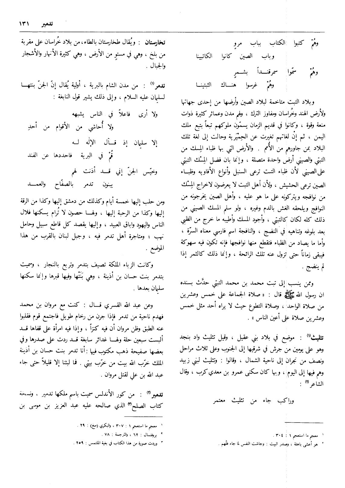 وخيس الجن إني قد أذنت لهم ... يبنون تدمر بالصفاح والعمد ومن حلب إليها خمسة أيام وكذلك من دمشق إليها وكذا من الرقة إليها وكذا من الرحبة إليها، ولها حصون لا ترام يسكنها فلال الناس واليهود واباق العبيد، وإليها يقصد كل قاطع سبيل وحامل نهب، ومتاجرة أهل تدمر فيه، وجبل لبنان بالقرب من هذا الموضع.