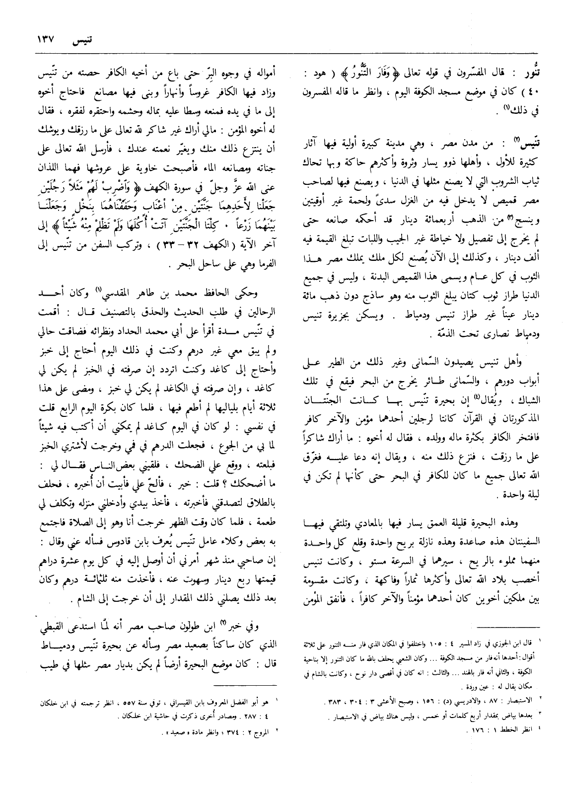 وهذه البحيرة قليلة العمق يسار فيها بالمعادي وتلتقي فيها السفينتان هذه صاعدة وهذه نازلة بريح واحدة وقلع كل واحدة منهما مملوء بالريح، سيرهما في السرعة مستو، وكانت تنيس أخصب بلاد الله تعالى وأكثرها ثماراً وفاكهة، وكانت مقسومة بين ملكين أخوين كان أحدهما مؤمناً والآخر كافراً، فأنفق المؤمن أمواله في وجوه البر حتى باع من أخيه الكافر حصته من تنيس وزاد فيها الكافر غروساً وأنهاراً وبنى فيها مصانع فاحتاج أخوه إلى ما في يده فمنعه وسطا عليه بماله وحشمه واحتقره لفقره، فقال له أخوه المؤمن: ما لي أراك غير شاكر لله تعالى على ما رزقك ويوشك أن ينتزع ذلك منك ويغير نعمته عندك، فأرسل الله تعالى على جناته ومصانعه الماء فأصبحت خاوية على عروشها فهما اللذان عنى الله عز وجل في سورة الكهف: " واضرب لهم مثلاً رجلين جعلنا لأحدهما جنتين من أعناب وحففناهما بنخل وجعلنا بينهما زرعاً كلتا الجنتين آتت أكلها ولم تظلم منه شيئاً " إلى آخر الآية، وتركب السفن من تنيس إلى الفرما وهي على ساحل البحر.