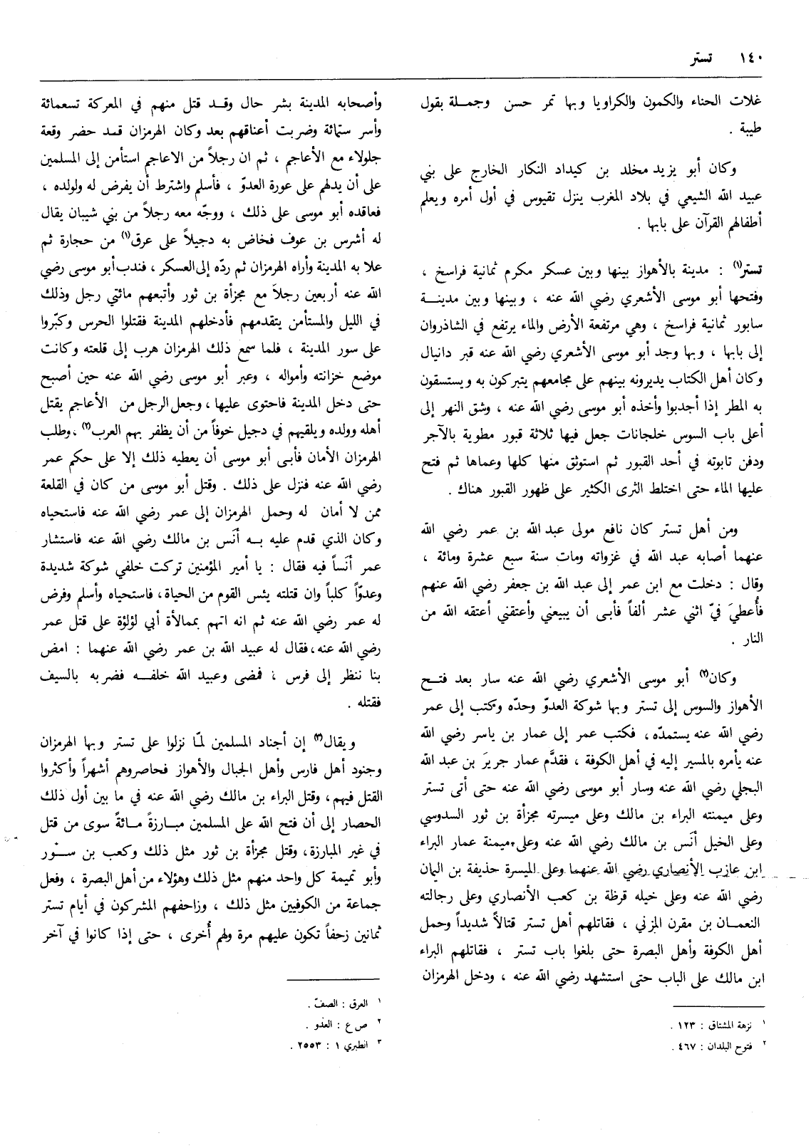 ويقال (5) إن أجناد المسلمين لما نزلوا على تستر وبها الهرمزان وجنود أهل فارس وأهل الجبال والأهواز فحاصروهم أشهراً وأكثروا القتل فيهم، وقتل البراء بن مالك رضي الله عنه في ما بين أول ذلك الحصار إلى أن فتح الله على المسلمين مبارزة مائة سوى من قتل في غير المبارزة، وقتل مجزأة بن ثور مثل ذلك وكعب بن سور وأبو تميمة كل واحد منهم مثل ذلك وهؤلاء من أهل البصرة، وفعل جماعة من الكوفيين مثل ذلك، وزاحفهم المشركون في أيام تستر ثمانين زحفاً تكون عليهم مرة ولهم أخرى، حتى إذا كانوا في آخر